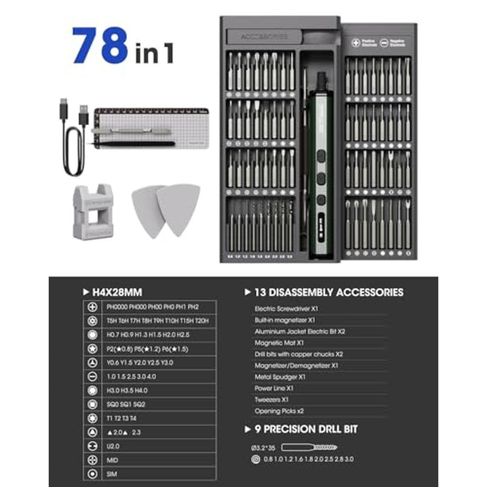 Mini Electric Screwdriver Set Cordless, 78 in 1 Small Precision Screwdriver Set, 65 S2 Preicison Bits, 5 Torque Settings, 4 LED Lights, Magnetic Portable Screwdriver Repair Tool Kit Rechargeable for PC RC Electronic, Watches, Computers, Clocks, Cell Phones