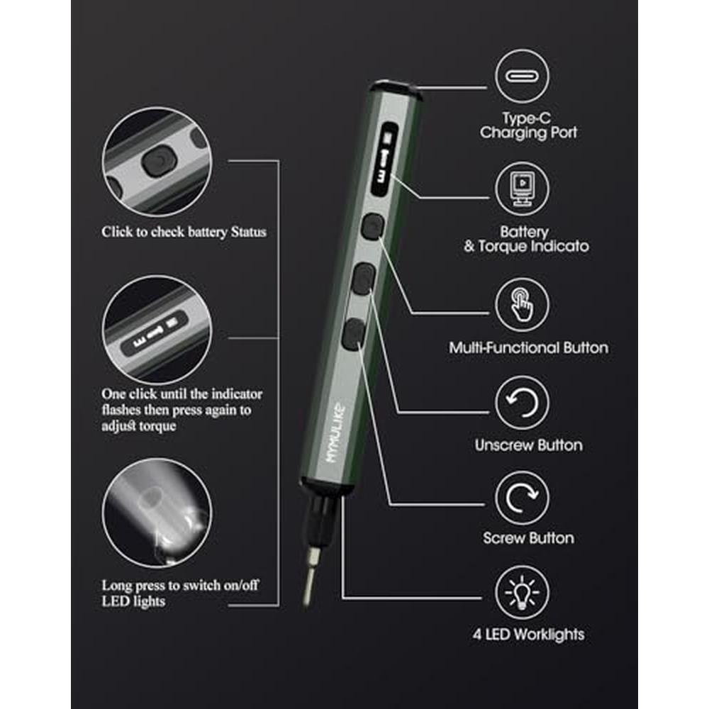 • 5 TORQUE SETTINGSMYMULIKE precision electric screwdriver set features 5 adjustable gear torques, ranging from 0.1 to 0.5N.m. The magnetic precision screwdriver is specially designed to meet various precision repair needs, allowing for easy adjustment of precise torque to satisfy the precision repair requirements of electronic products such as computers, watches, keyboards, and timepieces