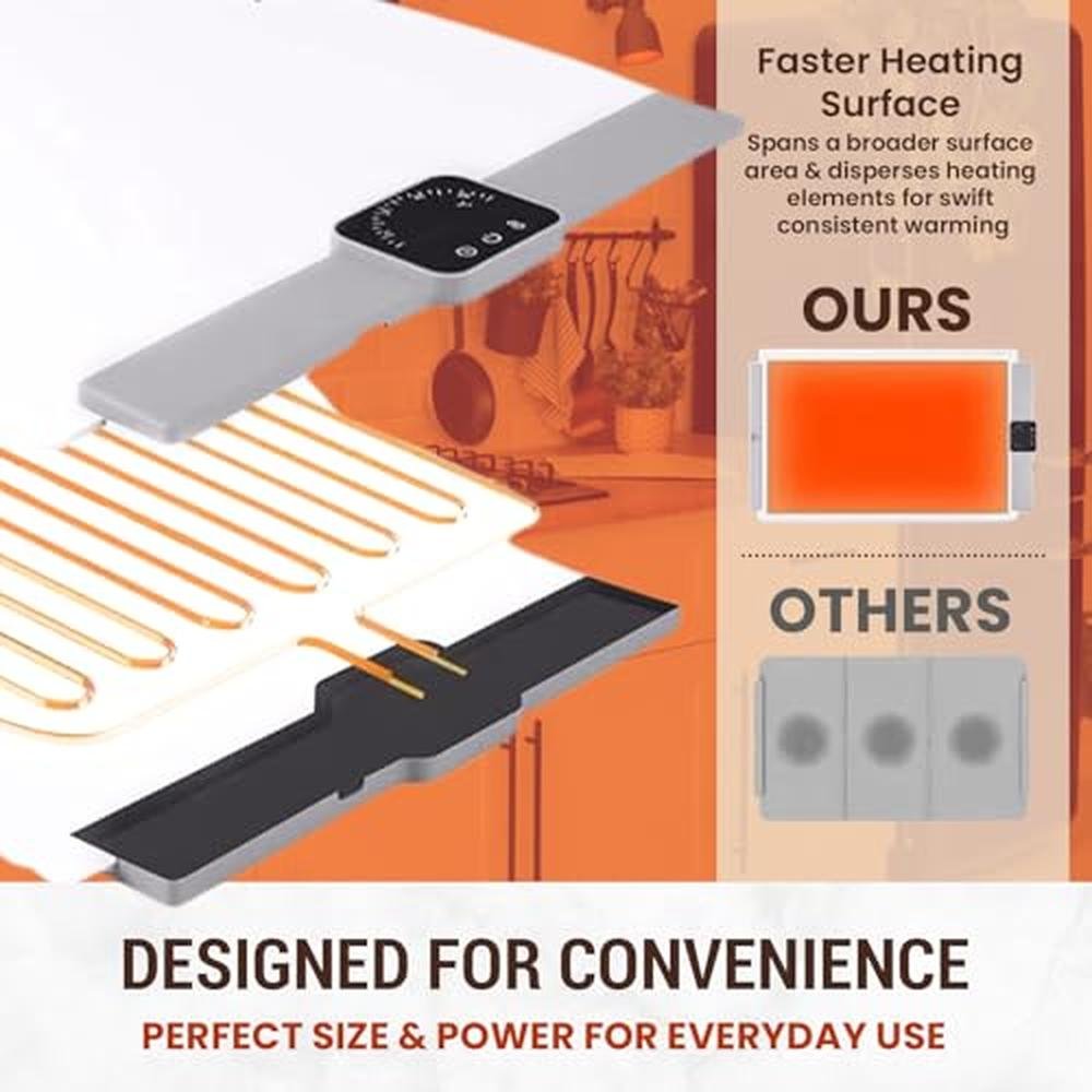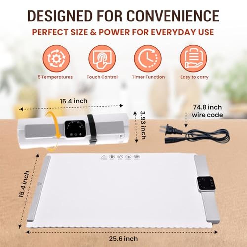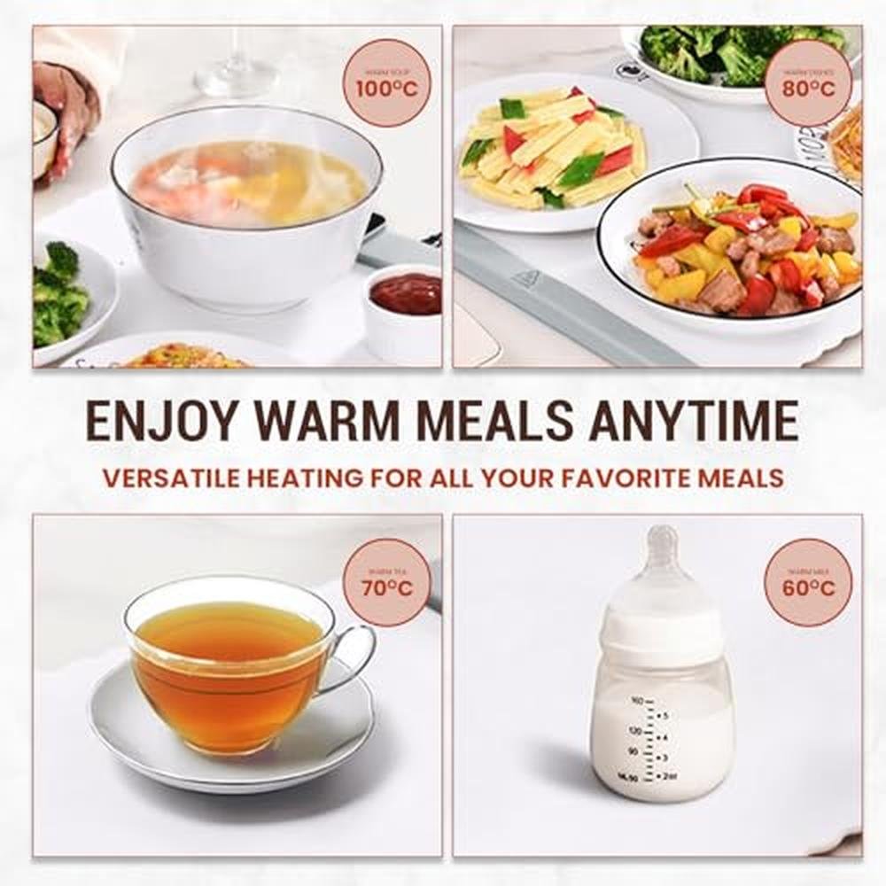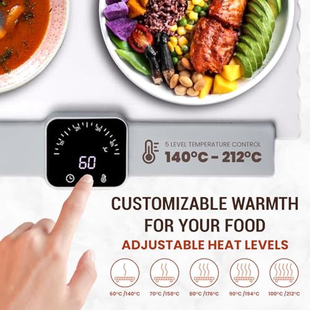 - User-Friendly and Enlarged Size: This heating mat for food allows you to adjust the heat level up to 5 settings to suit various dishes. 60C- 100C(140F- 212F), 4 timers setting 1H to 4H. Whether youre keeping soups, casseroles, or delicate desserts, youll always have the perfect heat to match your needs. A 25.515.3 inches large electric warming mat for food is ideal for providing a spacious area for a variety of food items, including small platters, whole pizzas, and assorted snacks. This makes it an ideal choice for family dinners, picnics, or social dining with friends. In comparison to traditional food warmers, our upgraded food warming tray offers a larger surface area.