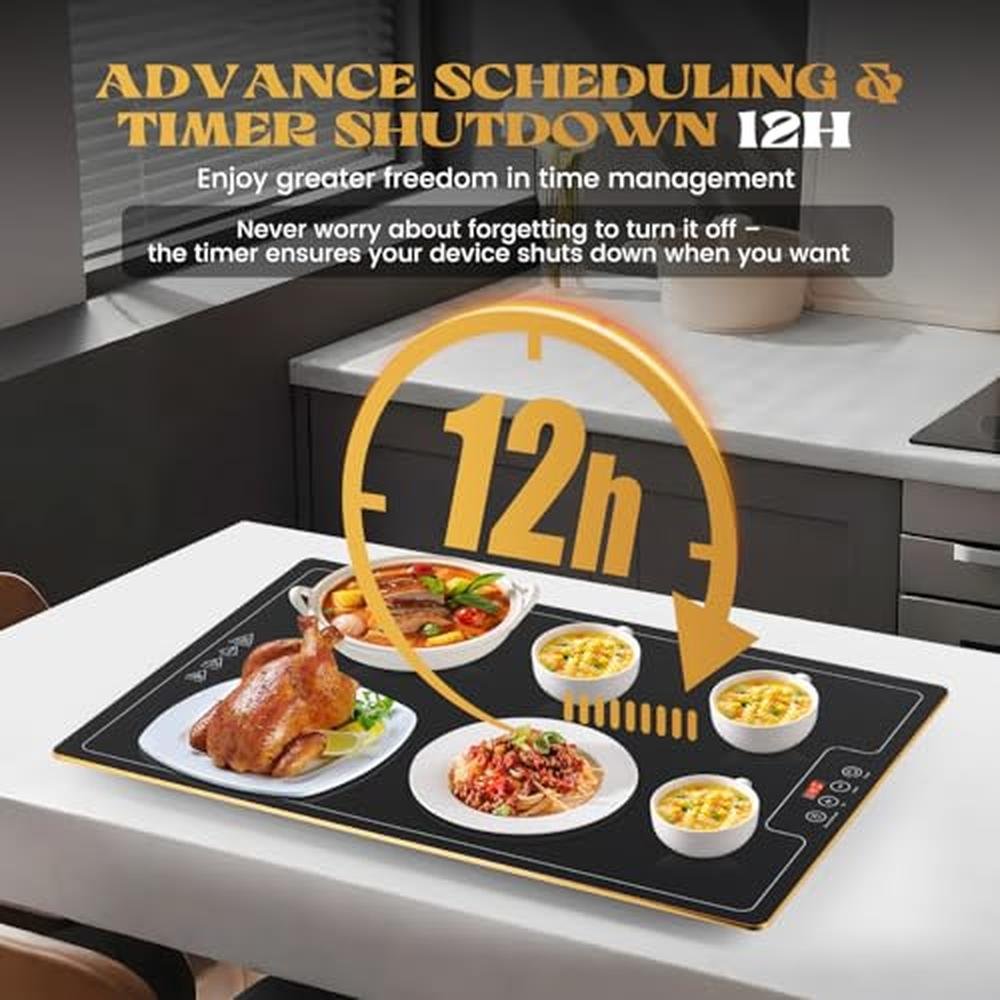 • Timer/Schedule Function -- Featuring a 12 or 24-hour timer, you can schedule the warming tray to turn on or off automatically. Ideal for preheating before meals or saving energy after use, making it both convenient and efficient.