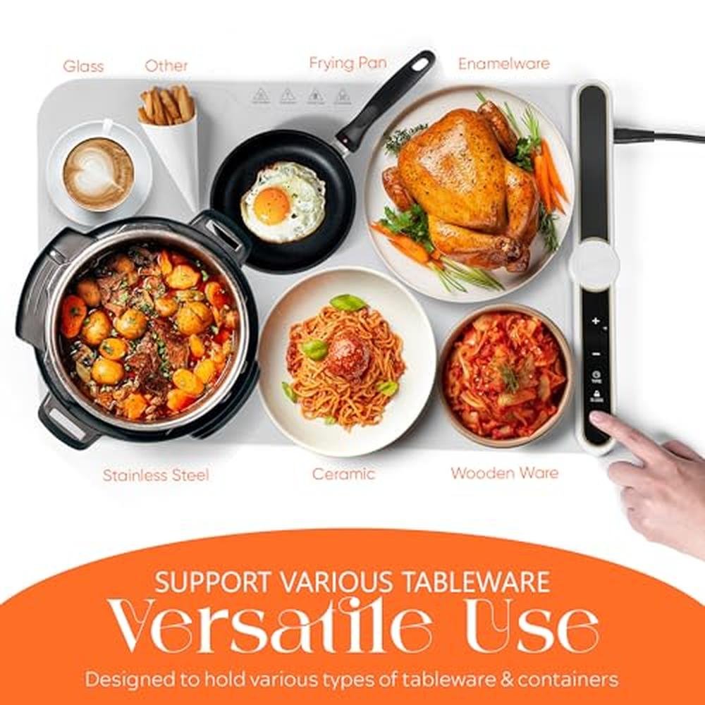 - Large & Multi-Use This 23.6" x 15" heating pad for food warming holds up to six dishes, making it perfect for family meals, meal prep, and catering events. It is compatible with a wide range of cookware, including stainless steel, glass, ceramic, enamelware, and wooden ware, offering versatile and reliable heating for all your dining needs.