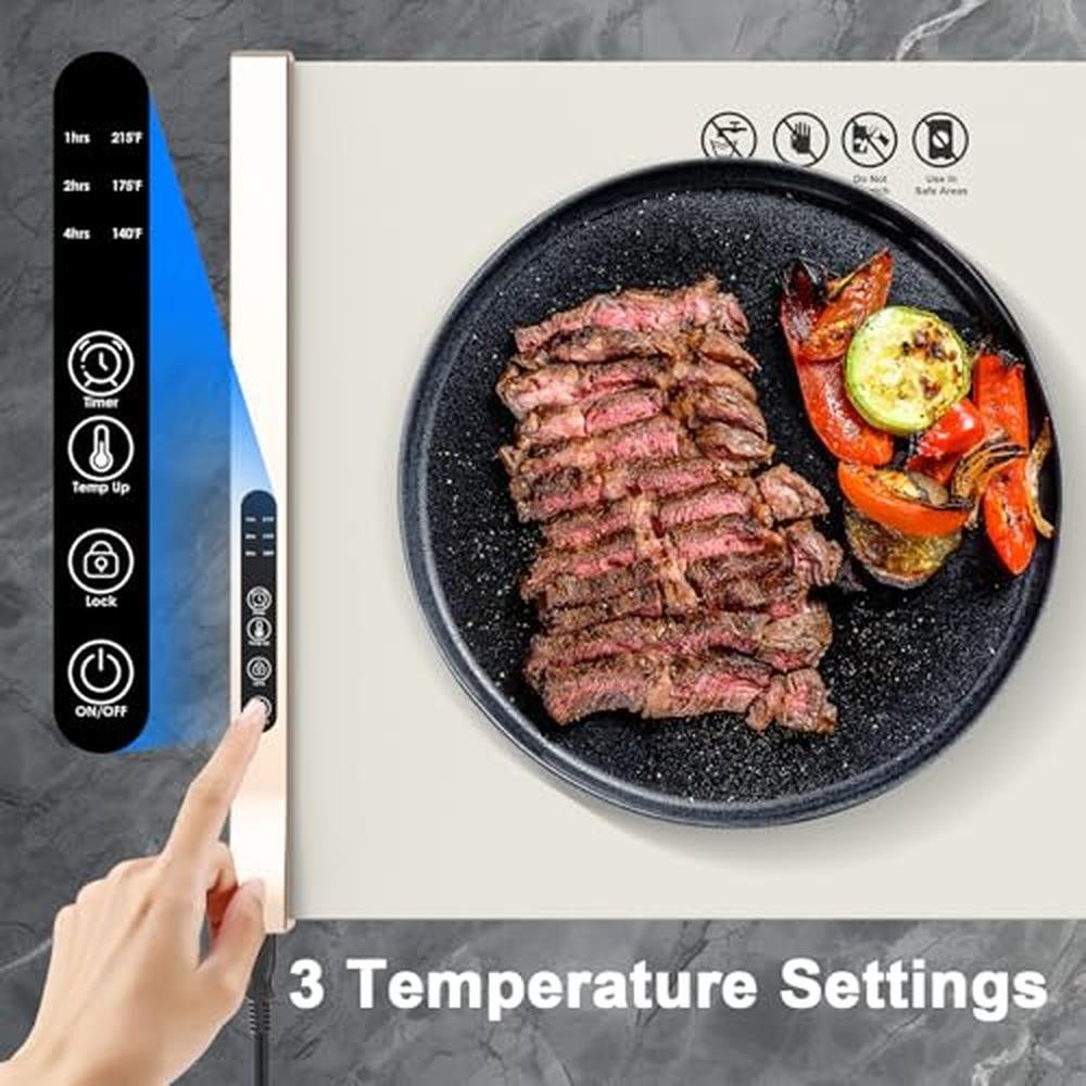 • Premium Silicone Material & Safety LockElectric warming tray is made of food grade silicone materials, our food warming mat is durable, stain-proof, and oil-proof. It can be rolled up for storage without unsightly creases, ensuring long-lasting quality. The safety lock function ensures safety during use, preventing child accidental operations, suitable for home use.