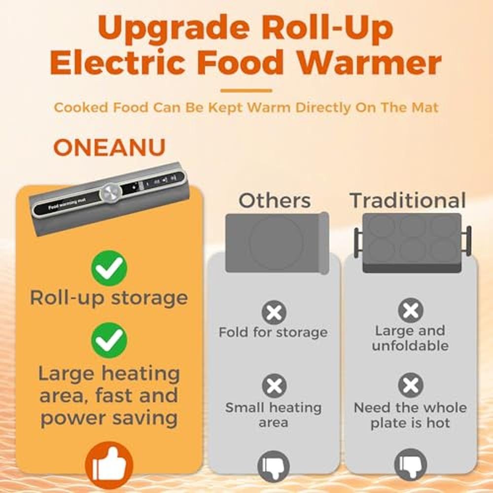 ONEANU Food Warming Mat - Fast Heating Silicone Electric Warming Tray with 9 Level Temperature, 0-6 Hours Timer Raised Feet Protects Countertop, Portable Food Warmer Pad for Parties Home Buffet