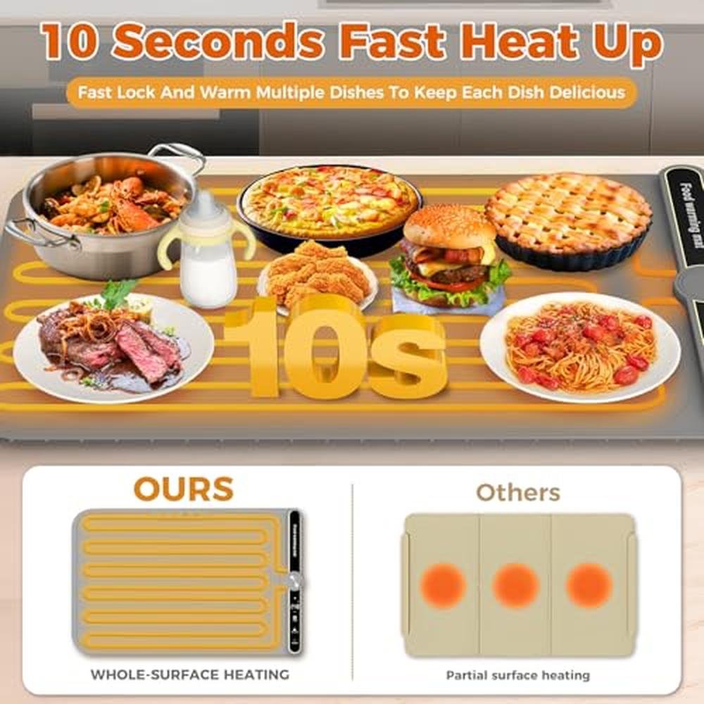 - 10s Fast Heating: Our heating wire utilizes an upgraded and optimized process that covers the entire bottom surface, enabling rapid heating in just 10 seconds and efficient heat transfer. The full-surface design ensures even heating of food at a consistent temperature, except for the anti-scald edge, effectively addressing the issue of uneven warming commonly found in traditional electric warming trays. It supports the combination placement of both large and small plates, maximizing the utilization of the food warmer