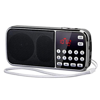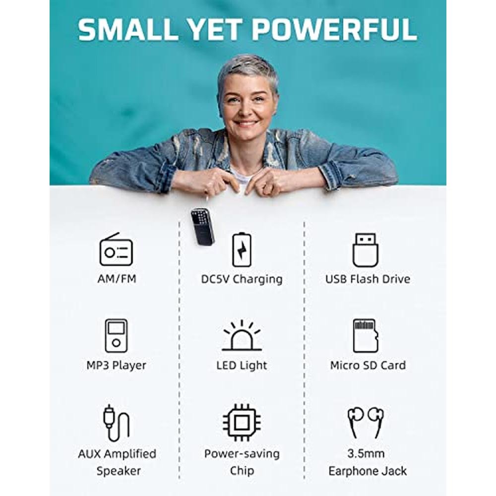 - PORTABLE DESIGN1) am fm radio with bluetooth size is LxWxH(5 x 2.3 x 1 inch).The AM FM digital radio weights only 4.4oz with thickness only 1inch, quite easy to carry around; 2) Equipped with a silver strap (also as a hidden antenna), the hand held pocket radio can be hung as you like. Meanwhile, its either stylish or portable no matter youre outdoors or indoors