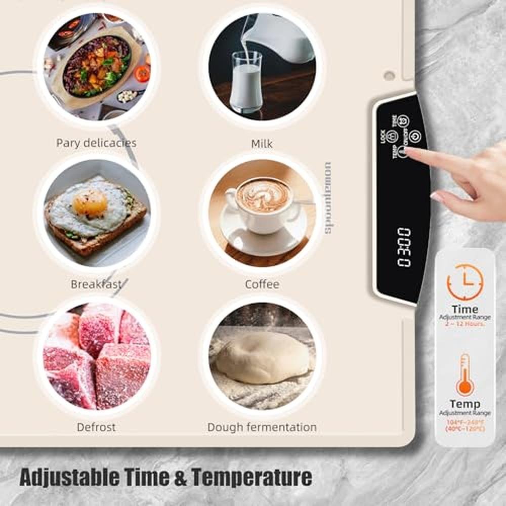 - Adjustable Time & Temperature ControlThe spoonlemon warming mat for food allows you to precisely control the temperature between 104 to 248 (40~120) with an adjustable time setting from 2 to 12 hours. Whether for a buffet, family dinner, or special event, you can keep your food at the perfect serving temperature for hours, ensuring a consistent, high-quality dining experience.