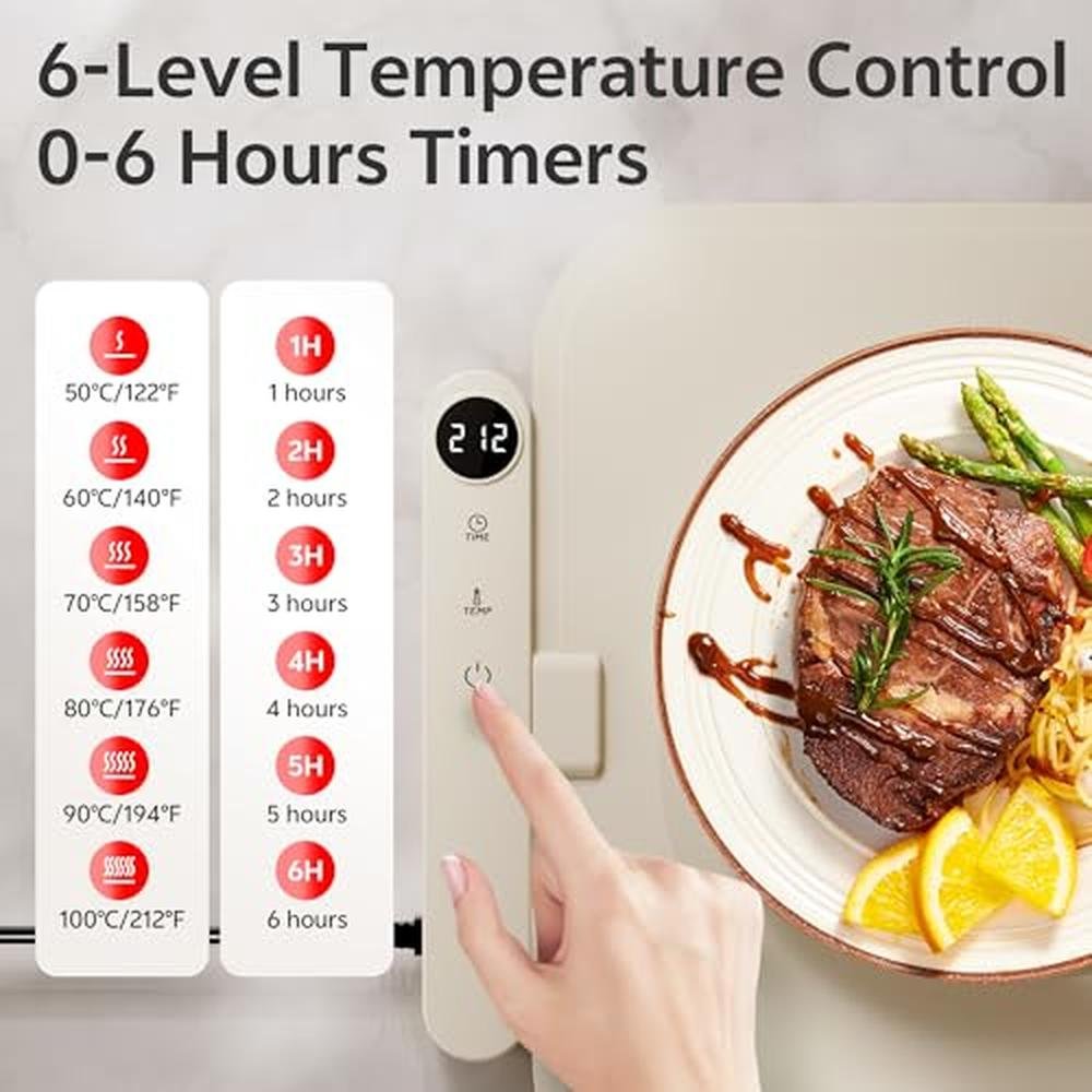 - Adjustable 6-Level Temperature Control: Our electric warming tray offers 6 - level temperature settings (122/140/158/176/194/212F) /(50/60/70/80/90/100) and 0 - 6 hours of timed warming. Adjust to your needs, whether it's gently warming desserts or keeping stews hot for a satisfying meal