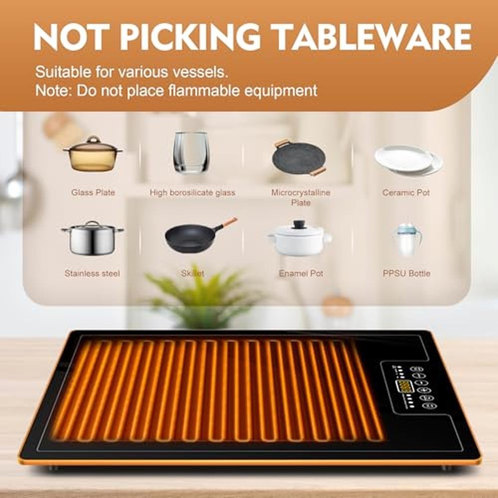 - [Extra Large Size & Resistant to Pressure and Falling] Do you think the traditional warming cutting board is too small? We offer huge sizes to solve this problem,Its no problem to place 6 to 8 dishes. The plate is made of tempered glass, which is smooth and flat, resistant to pressure and falling. You can put the pot directly on it. Perfect for family gatherings, buffets and restaurants.