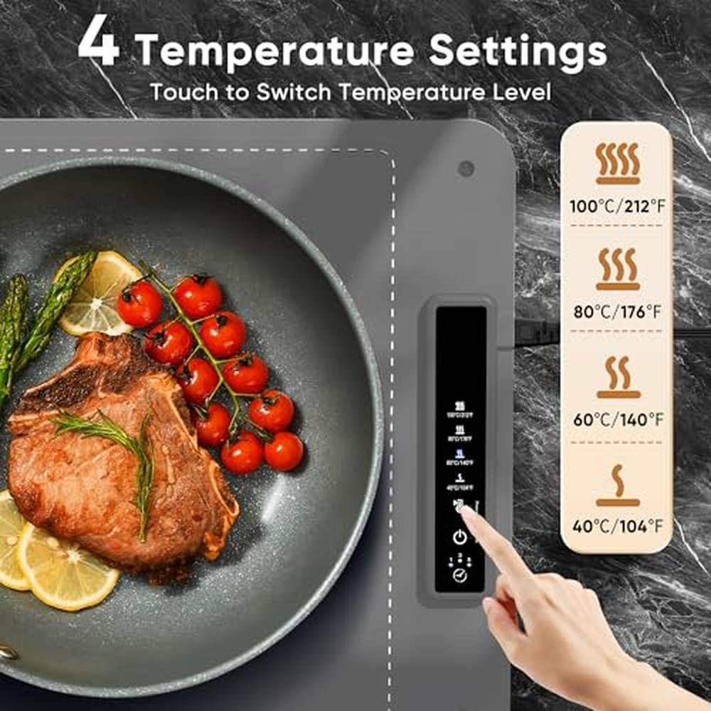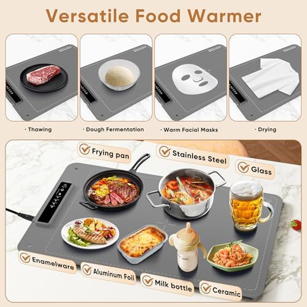 - Full-Surface Heating in 10 Seconds With an upgraded heating wire process that covers the entire base, our warming plate achieves full-surface heating in just 10 seconds, ensuring rapid heat transfer, and minimizes waiting time for social gatherings and dining experiences. It is compatible with all types of heat-resistant tableware, such as ceramics, glass, stainless steel, takeout boxes, and plastic.