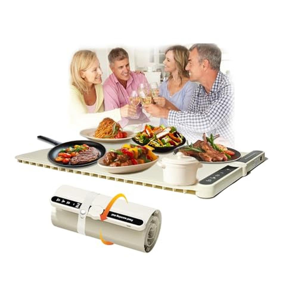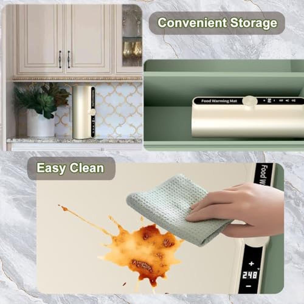 • Easy to Clean & OdorlessThe electric warming trays for food is made of quality flexible silicone material, one piece molding and is durable. Its nano-coating surface resistant to splashes, oil, stains are cleaned with a single wipe, no hassle cleaning after meals. Moreover, the food-grade material of the food warmers is no odor, excellent flexibility.The food warmers for parties are easy to roll up for storage and are very portable for travel