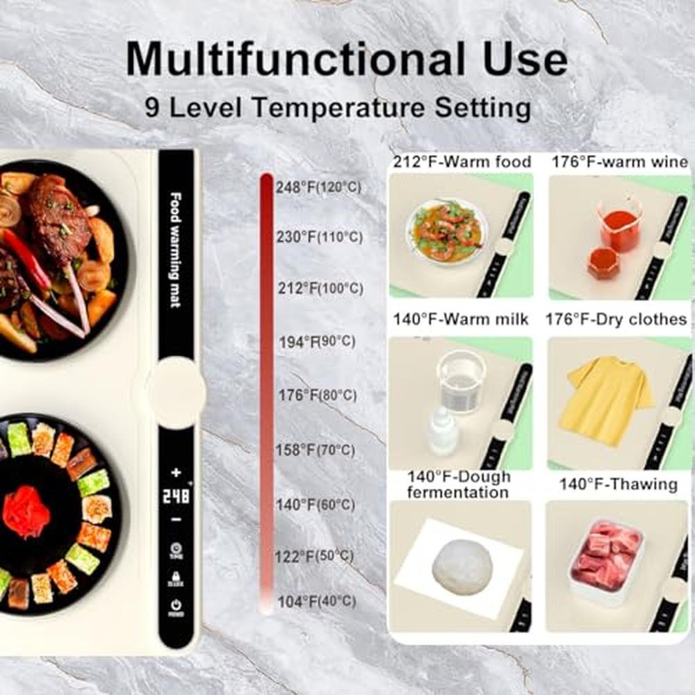 • Keep Foods Warm & Delicious!The heating mat for food has a maximum adjustable temperature of 120C(248F), with 9 temperature settings, superior to the 100C and 3 temperature settings of ordinary warming mats for food. Our electric warming tray for food is between 40C-120C(104F-248F). heating trays to keep food warm at party has stable warmth for 18 hours