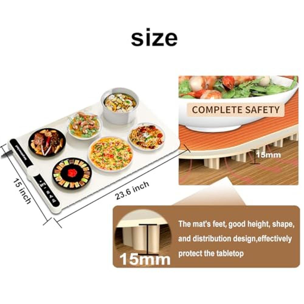• Child Level Safe Food Warming Traythe silicone warming mat will not cause burns even when the temperature is set to 120C(248F), and silicone warmer mat is designed with heat-resistant areas around the edges of the warming tray for added safety. The support footers with well-designed shape and height provide stable support for the panel, allowing it to withstand significant pressure. The raised footers(5mm higher than others) are designed to protect the table surface from overheating.
