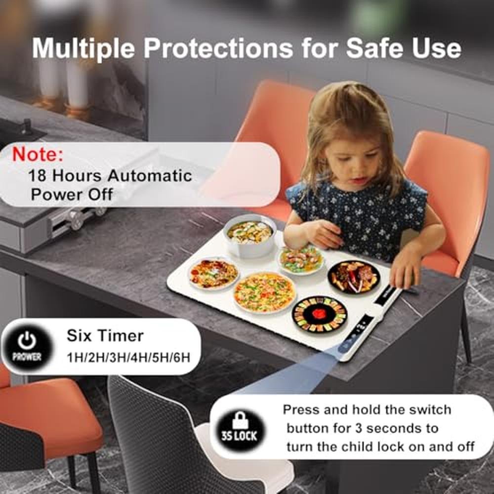 • with Child lock and Auto Shut-Off The food warming mat features a child lock function, effectively preventing accidental operation or children touching. warming trays for buffets party have a safety protection feature that automatically shuts off power after 18 hours.