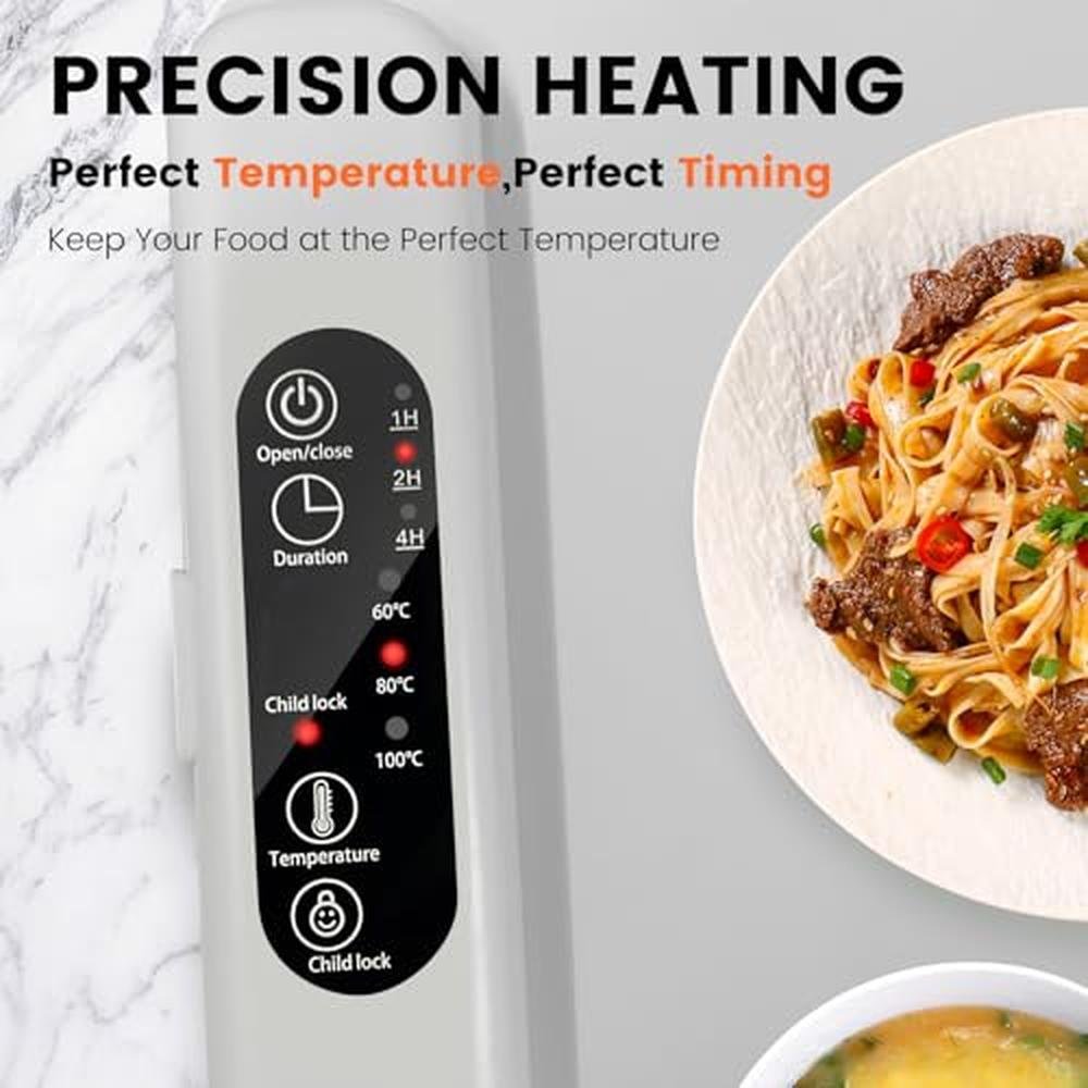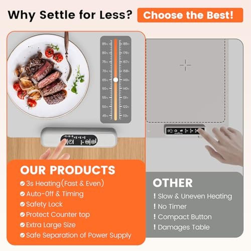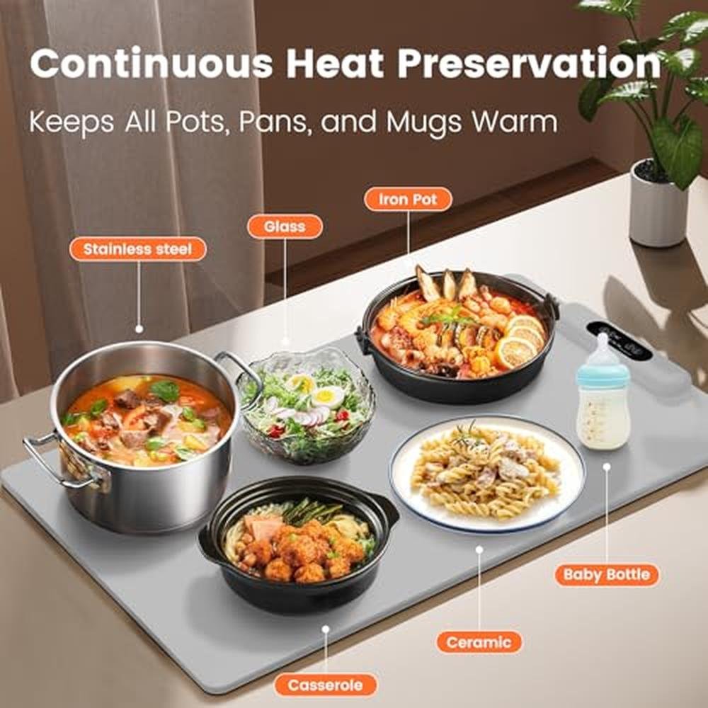 - 3x Rapid Full-Surface Heating & Optimal Temperature ControlHot Plate warming mat for food uses advanced technology for 3X faster heating, ensuring even heat distribution across the entire surface. It offers 3 adjustable temperature settings60C, 80C, and 100Cperfect for preserving the freshness of your food. Whether for heat preservation or constant temperatureThe 1-, 2-, and 4-hour timer settings provide convenience for different heating needs.Dimensions: L: 23.62 in, W: 14.96 in, H: 0.63 in.