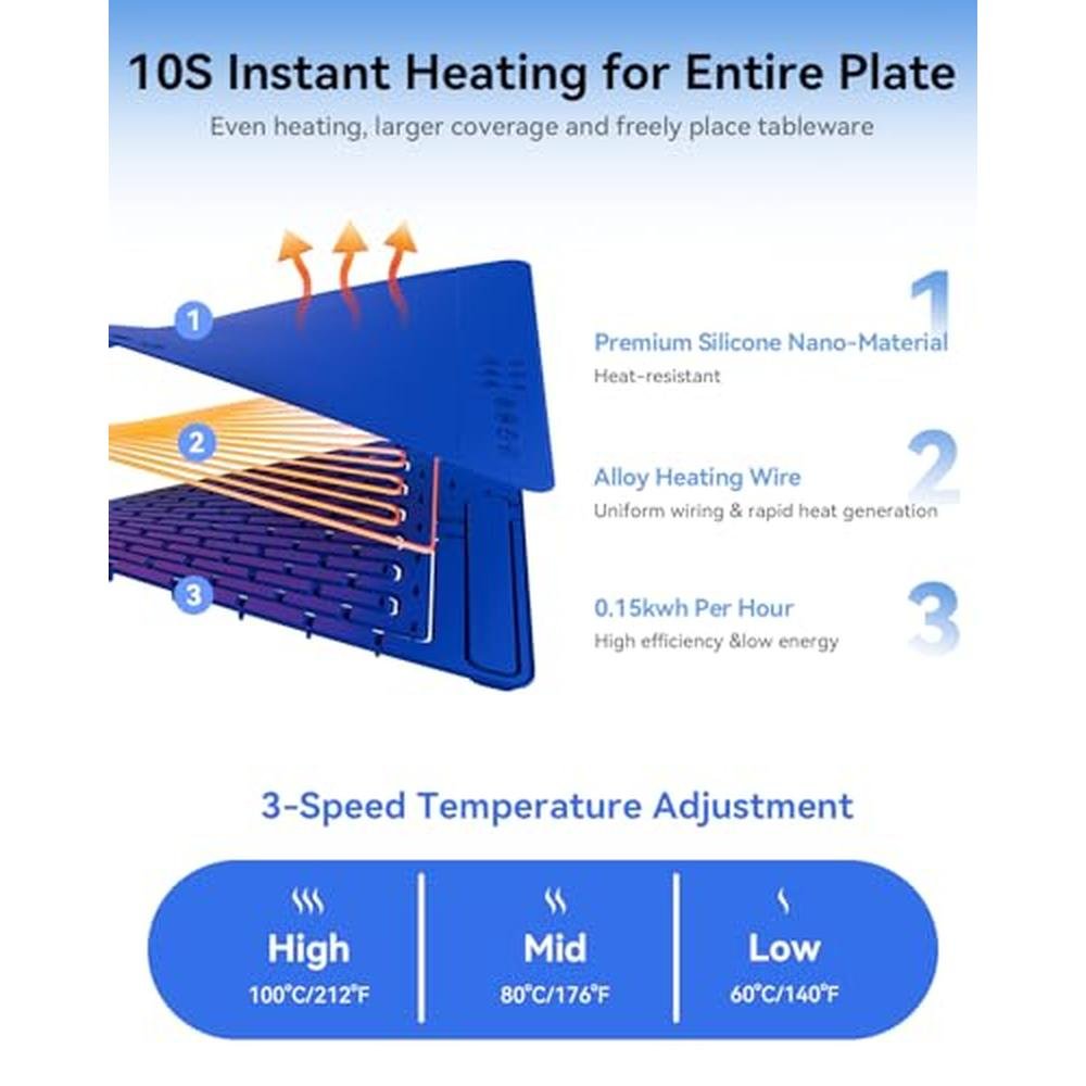 • 10s Fast & Even Heating: This Electric food heating mat featuring advanced graphene heating technology, even can be heat distribution across the entire surface in just 10s. This electric heating tray offers 3 adjustable temperature settings (from 140 to 212),it can be flexibly adjusted to meet different needs, ensuring every dish stays at its ideal temperature.Say goodbye to cold dishes and make your dining experience more delightful and pleasant.
