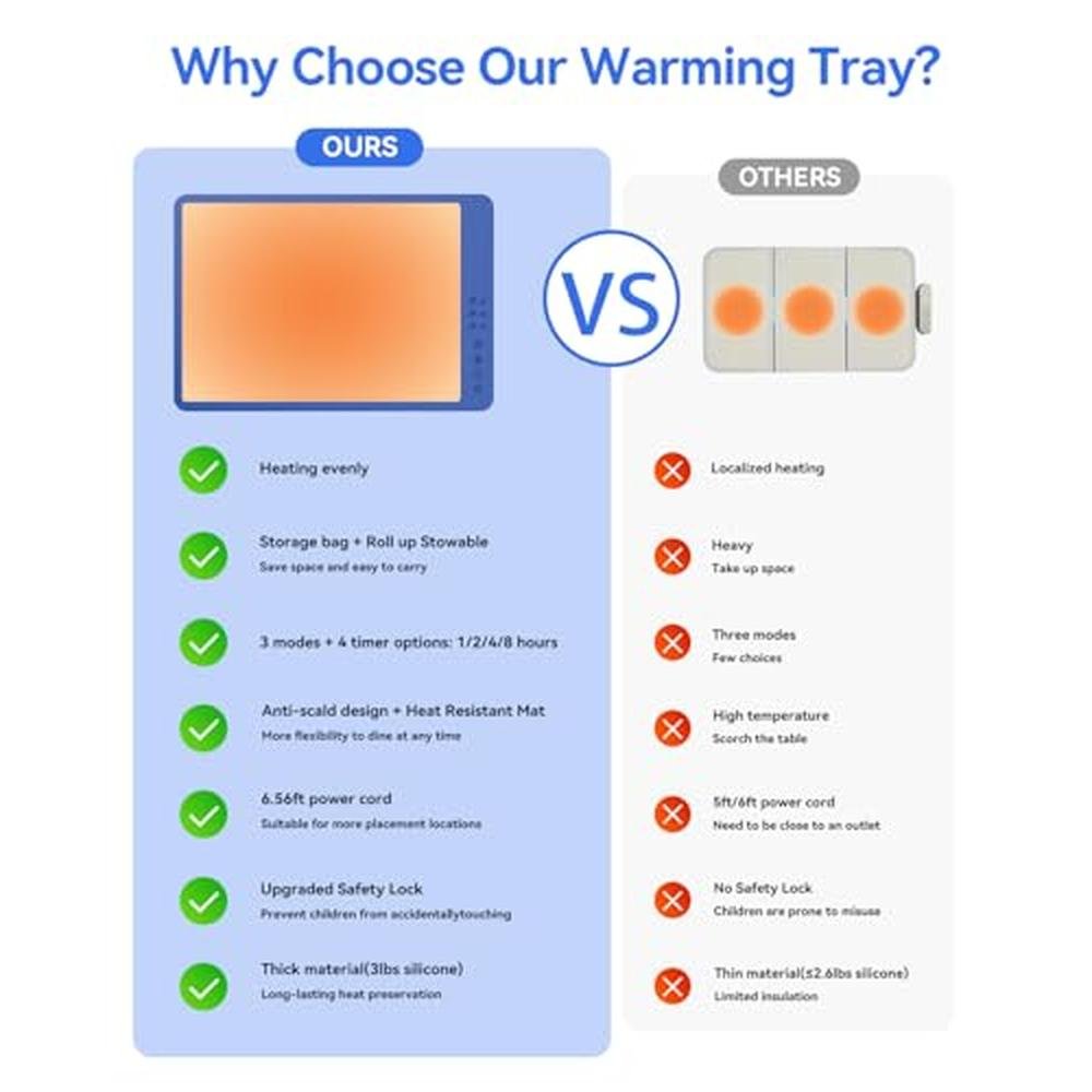 • Timer Settings: Food warming mat features 4 timer options (1-2-4-8 hours). With our touch control panel, you can easily set it according to your needs. The Electric food heating mat will automatically shuts off after 8 hours of inactivity for safety. A width of 2cm is reserved around the warming tray, not filled with heating components, to avoid scald caused by accidentally touching. This food warmer built-in child safety lock to prevent accidental touches, ensuring the safety of children.