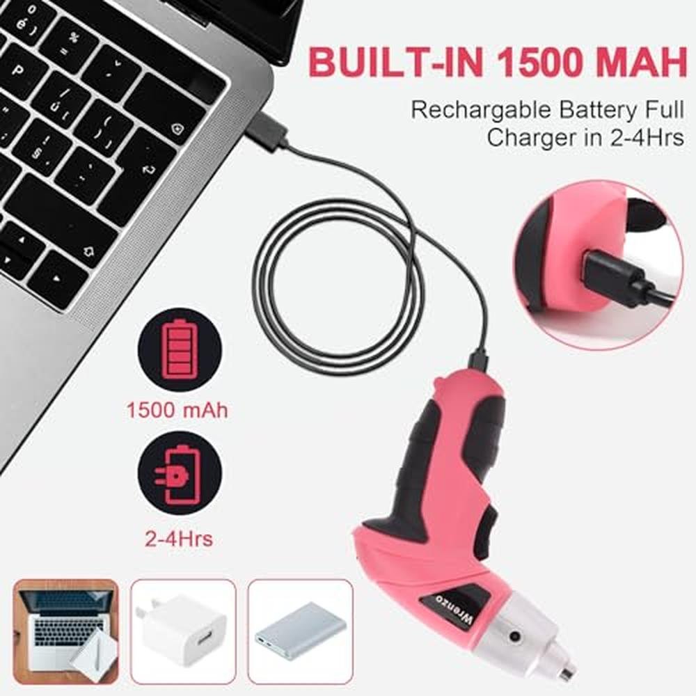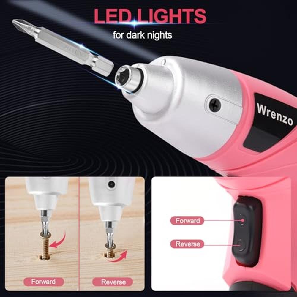Wrenzo Electric Screwdriver, 3.6V Cordless & Rechargeable Screwdriver Set, 28pc Drill Set with Led Lights, USB Charging Cable, Tool Knife, Pink