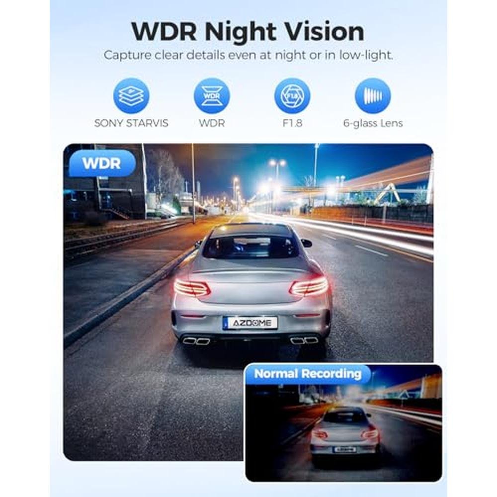 | Special features | Built-In Microphone, Speaker, Voice Guidance, 360 Rotation, 150+150 True Wide Angle View, Built-in WiFi6, AZDOME APP for iOS & Android, Timeline Review, Built-In GPS, Live Speed, Free 64GB Memory Card Included, Up To 512 External Storage Support, WDR (Wide Dynamic Range), SONY STARVIS Sensor, Super Night Vision Low Light Capture Technology, 2.4" IPS Wider Display |