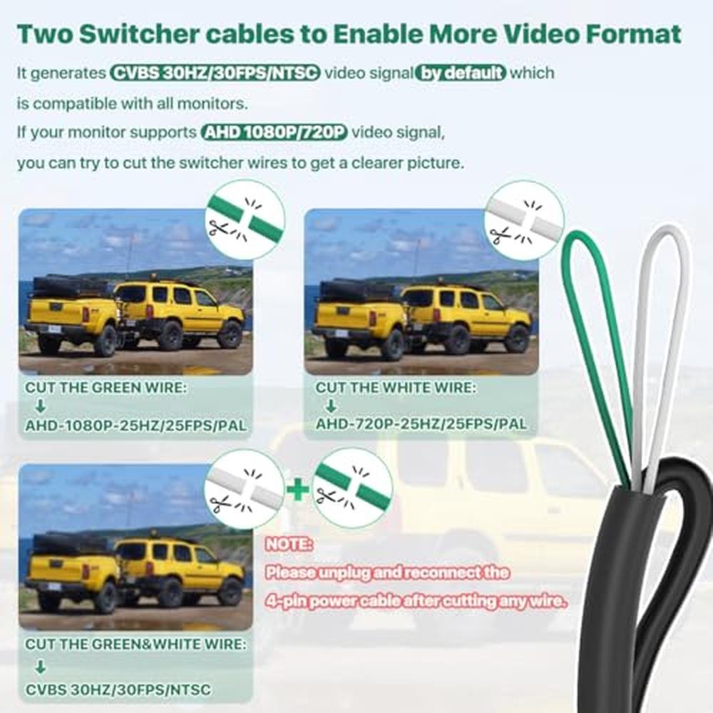 All of our 4-pin cameras can't be connected directly with any other monitors (no matter DVR or dash or whatever) without using our power cable. Product Parameters: Image Sensor: 1054 chip, TV System: PAL, Resolution: 1920*1080 Pixels, Viewing Angle: 170 degrees, Signal to Noise Ratio: >48dB, Waterproof Grade: IP68, Power: DC 12-24V, Minimum Illumination: 0.01Lux / F1.5, Working Humidity: 80%RH, Operating Temperature: -22F +140F, Storage Temperature: -40F+176F. Attention: There may be two guide lines shown on your head unit, please change the setting of your device to turn off the original one.