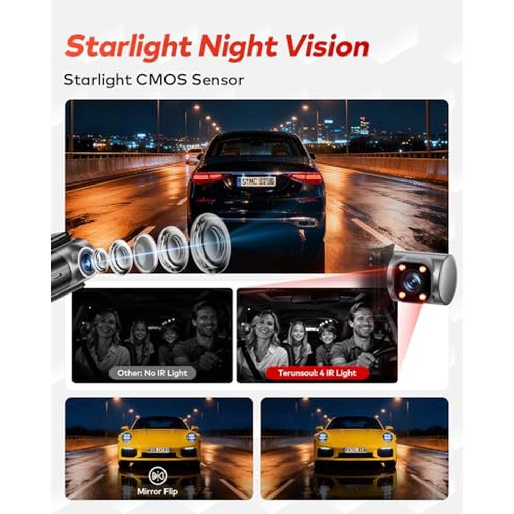 TERUNSOUl 4K+4K+1080p 3 Channel Dash Cam | Front and Rear with Cabin | Free 128GB Card Included, 5.8GHz WiFi6, IR Night Vision, Built-in GPS, G-Sensor, 24H Parking Mode