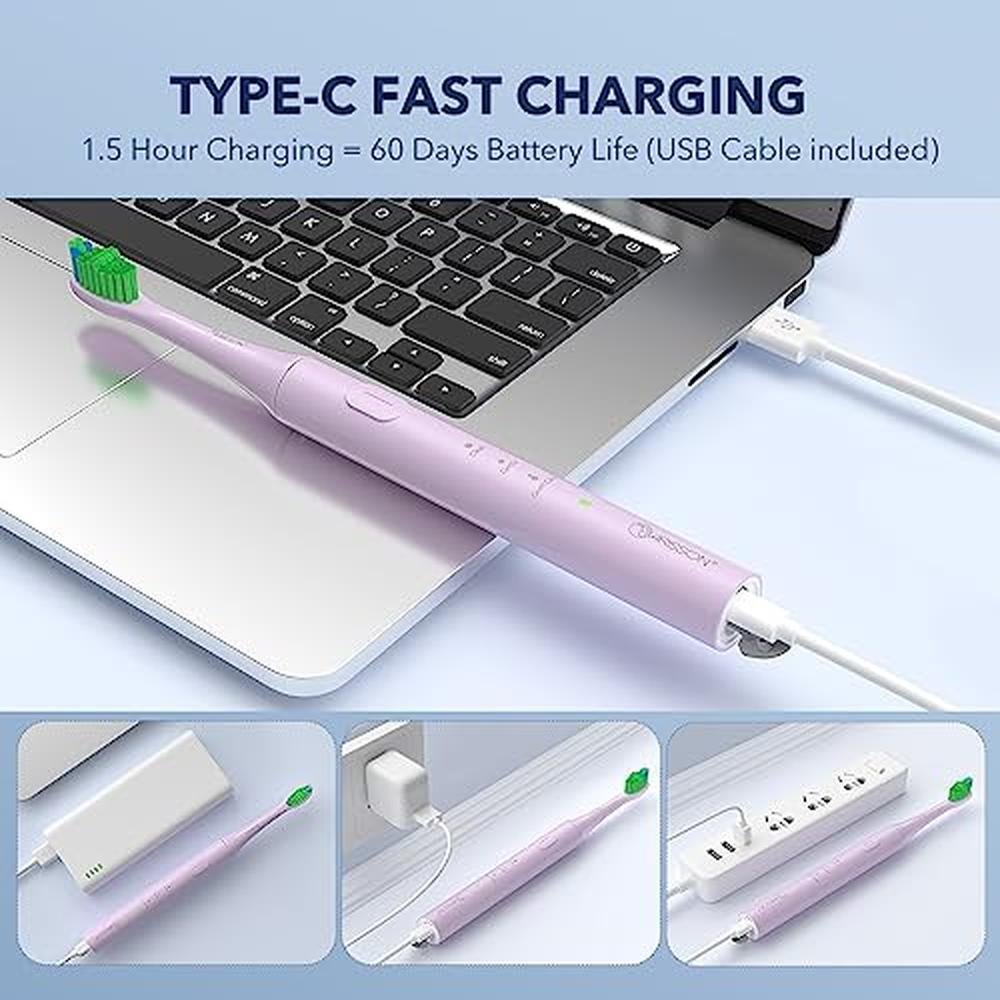 - Type C fast Charging & Light and Portable--- 1.5 Hours Charging for 60 Days Using (2 times per day)--- [1] Arisson rechargeable electric toothbrush, convenient and easy to charge using a widely available charging cable (Adapter is not included), having longer battery life compared to traditional charging methods. [2] The ultrasonic toothbrush weighs only 1.6 Oz, the lightweight handle makes this electric toothbrush suitable for both kids and adults. Great for carrying and traveling.