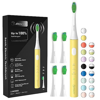 Arisson ultrasonic toothbrush features advanced sonic technology with up to 40,000 vibrations per minute, using rapid and powerful vibration to clean teeth and gums more effectively than manual brushing, which provides a powerful and effective cleaning experience.With its Type-C fast charging capability, the toothbrush can be charged quickly and efficiently. It also offers three different brushing modes (Clean, Gentle and Gum Care) for customized brushing and four DuPont brush heads for a comprehensive and cost-effective cleaning experience. The Arisson toothbrush's unique W-shaped design and end-rounded filaments ensure gentle cleaning and protection of gum tissue, while effectively cleaning hard-to-reach areas. Experience a deep and thorough clean for optimal oral hygiene with Arisson ultrasonic toothbrush!