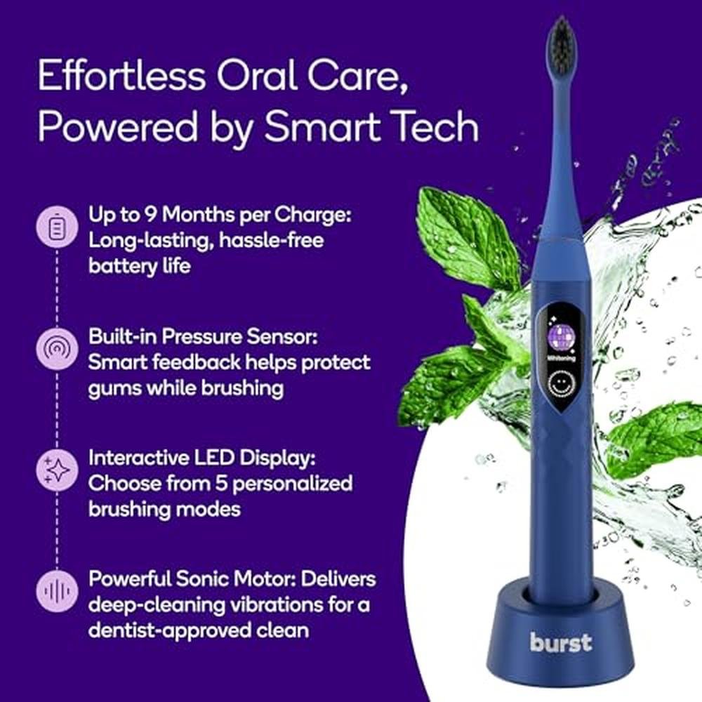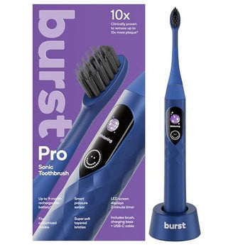 Experience unparalleled oral care with the Burst Pro Sonic Advanced Electric Toothbrush, designed for adults and featuring 33,000 powerful vibrations, advanced sonic technology, and multiple brushing modes for a healthier smile. With its long-lasting battery life and premium design, this toothbrush is clinically proven to deliver superior clinical results, removing up to 10x more plaque than a manual toothbrush and reducing gum bleeding up to 3x. Upgrade your oral care routine with this premium-grade electric toothbrush and discover the power of sonic technology.