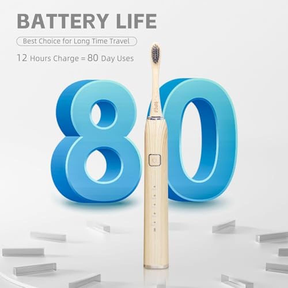 - RECHARGEABLE BAMBOO ELECTRIC TOOTHBRUSH - This bamboo toothbrush is fully charged once, and you can use for 11-12 weeks(use twice a day calculation), you dont need to charge frequently. It can maintain the best state in daily or journey, so that you can say goodbye to the trouble of no electricity.