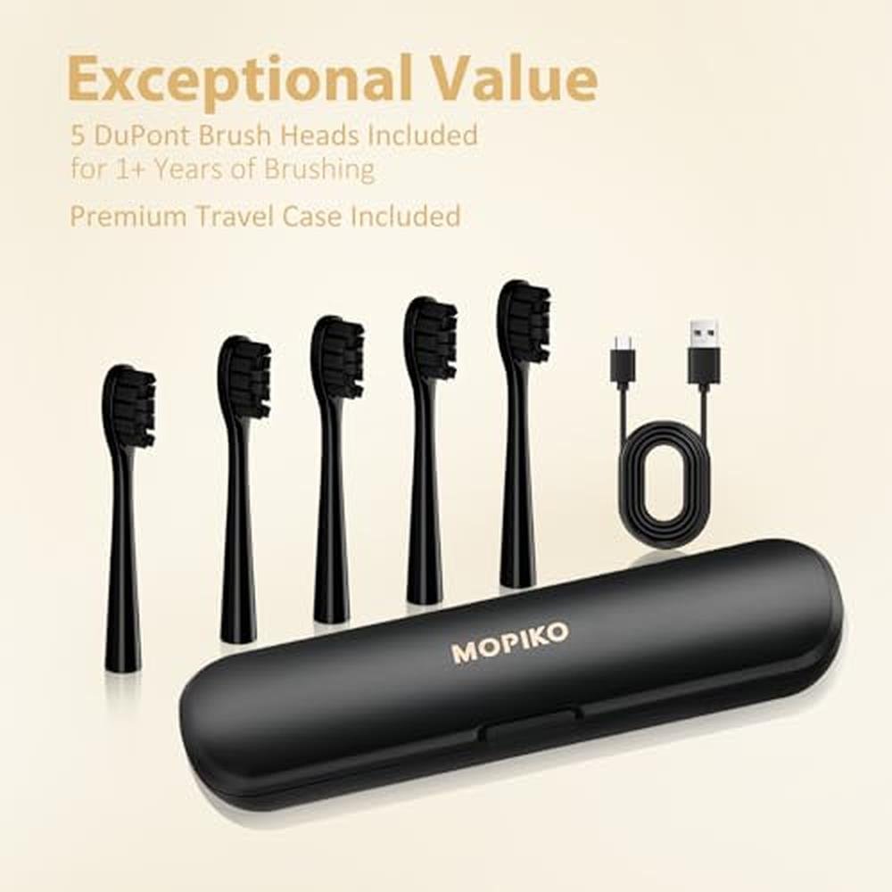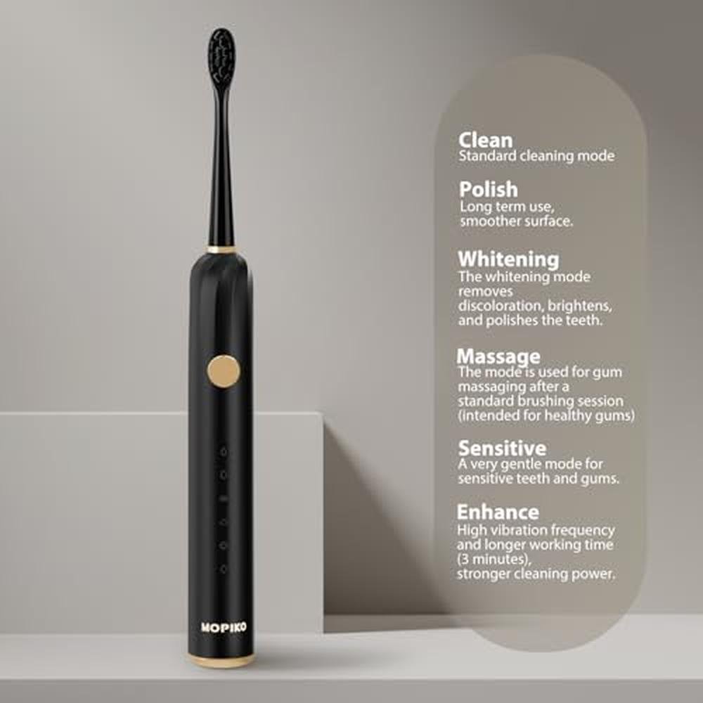 Experience the ultimate in oral care with our MOPIKO Sonic Electric Toothbrush, designed to deliver a superior cleaning experience. With 6 advanced modes and 4 replaceable brush heads, this power sonic toothbrush is perfect for adults looking to upgrade their daily routine. The built-in timer and auto-memory feature ensure effective 2-3 minute cleaning, while the IPX7 waterproof rating allows for fearless shower use. Get the most out of your electric toothbrush with 60 days of battery life on a single 3-hour charge. Includes a travel case and 4 replacement heads, making it an ideal gift for men and women.