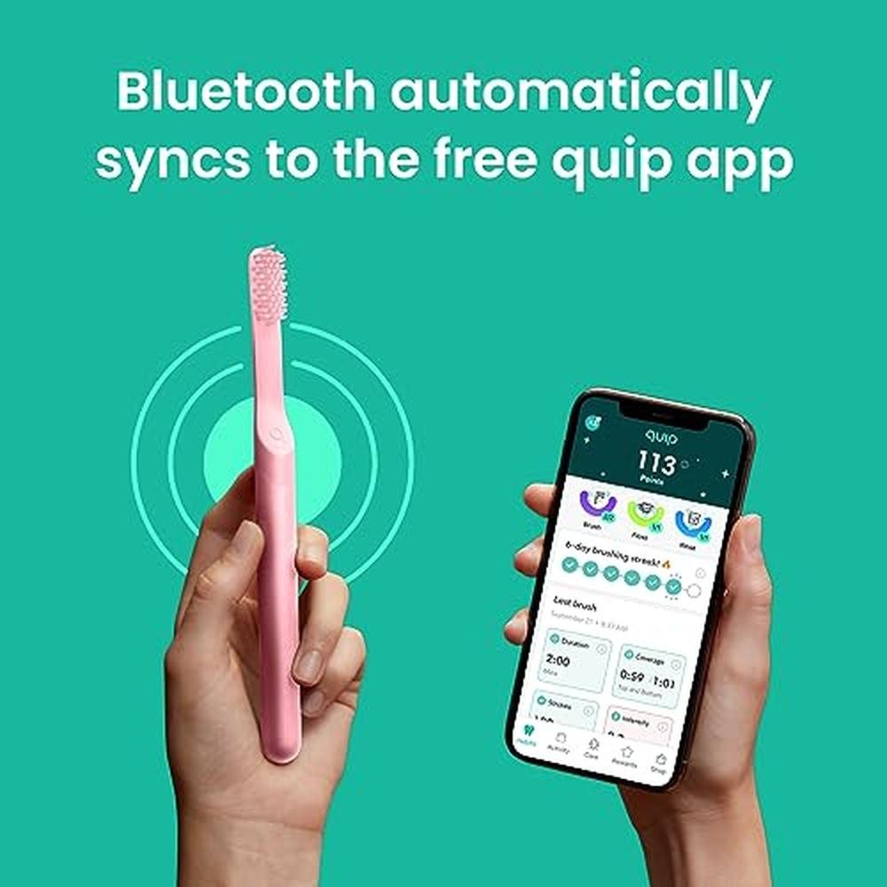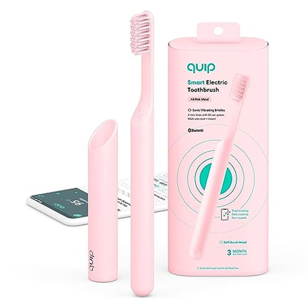 Upgrade your oral care routine with the Quip Smart Sonic Toothbrush, designed specifically for adults. This innovative electric toothbrush features a timed brushing mode, Bluetooth connectivity, and a user-friendly rewards app to track your progress. The toothbrush boasts a replaceable brush head with soft bristles, a durable metal handle, and an impressive 3-month battery life. Whether you're traveling or need a convenient cleaning solution, the Quip Smart Sonic Toothbrush is the perfect companion. Its all-pink design adds a touch of style to your bathroom. Experience the benefits of a healthier smile with Quip's smart toothbrush.