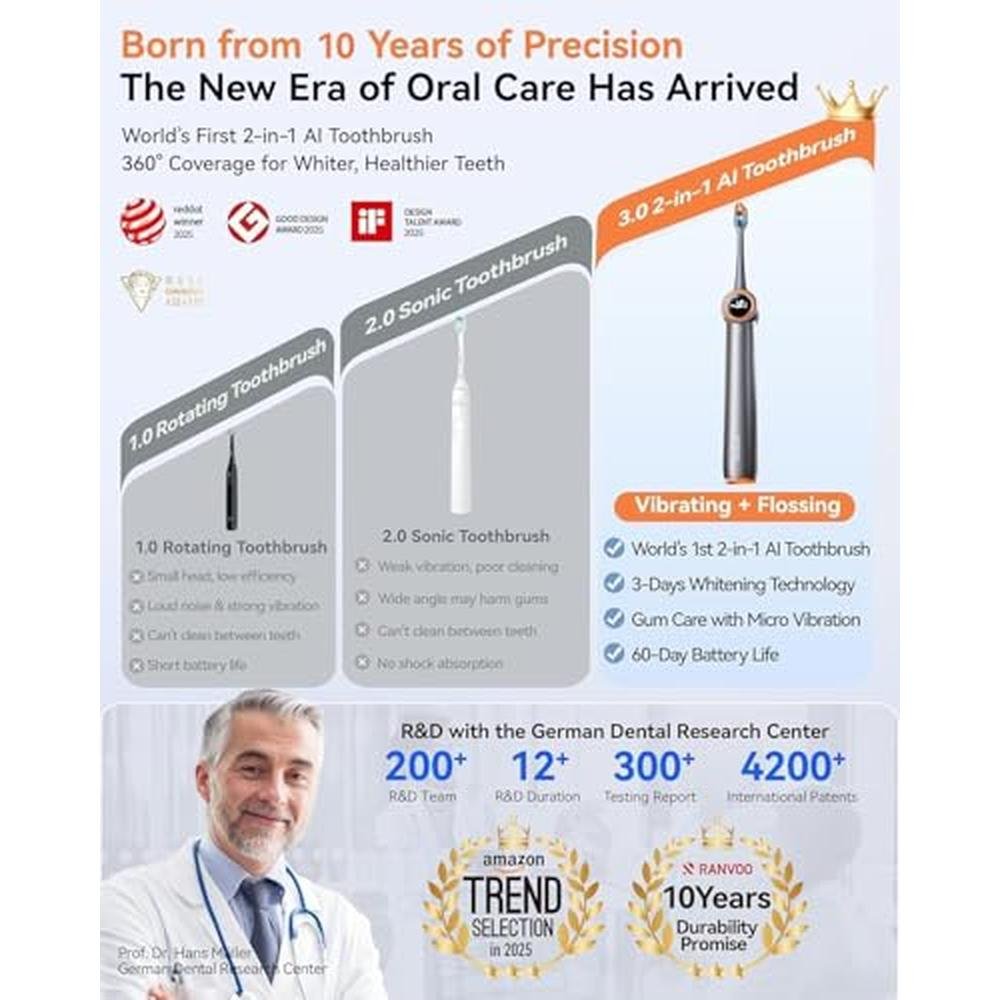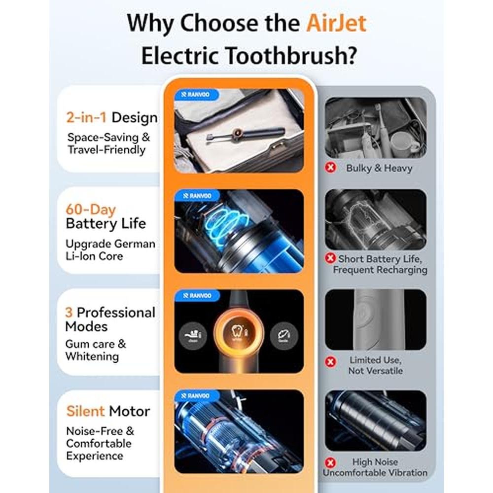 Sonic Electric Toothbrush for Adults | RANVOO AirJet PH3 | 2-in-1 Vibrating & Flossing | Premium Gum Protection