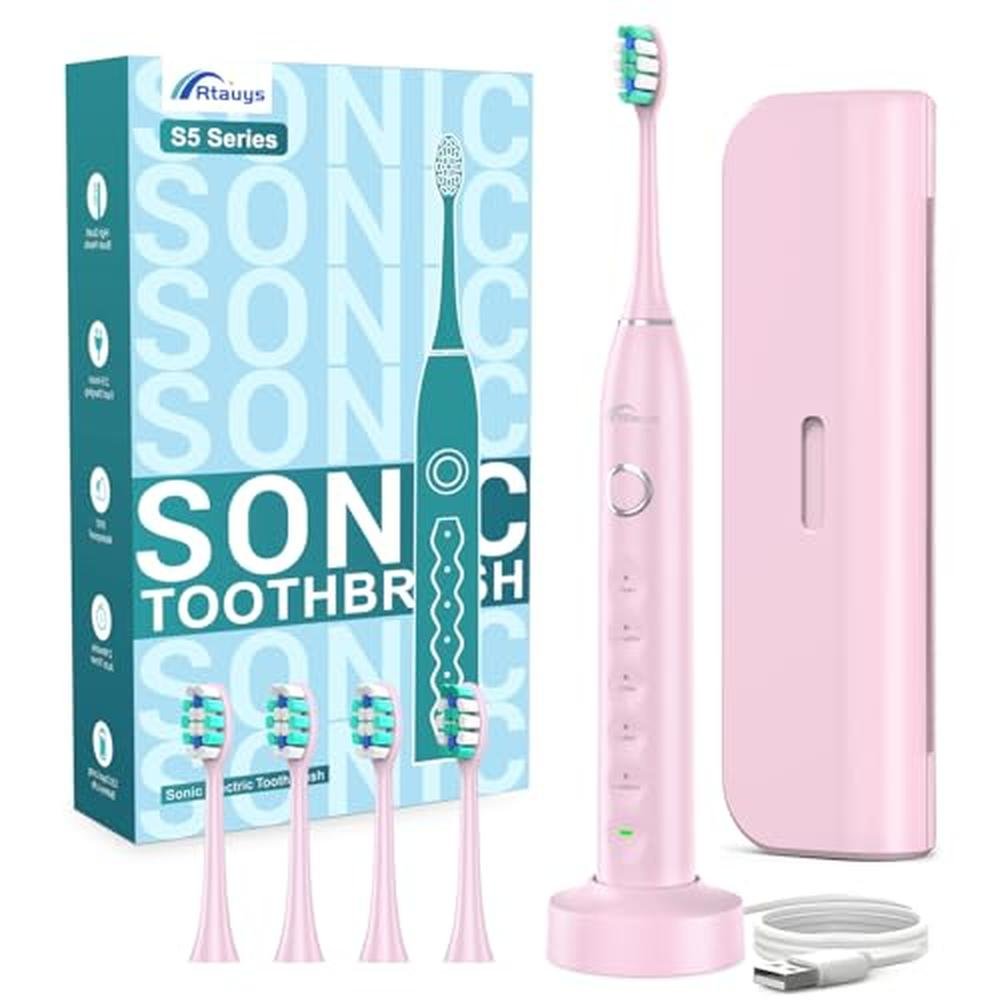 Rtauys Electric Toothbrush for Adults and Kids, Wireless Rechargeable Toothbrush One Charge for 120 Days, 5 Modes with Built-in Smart Timer 4 Brush Heads Pink