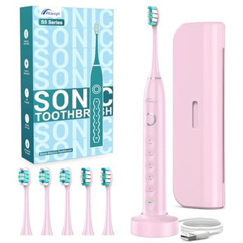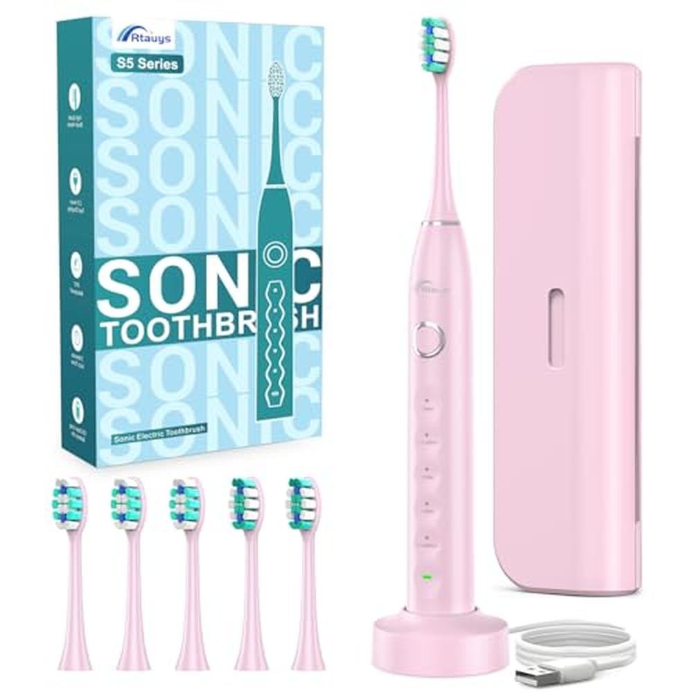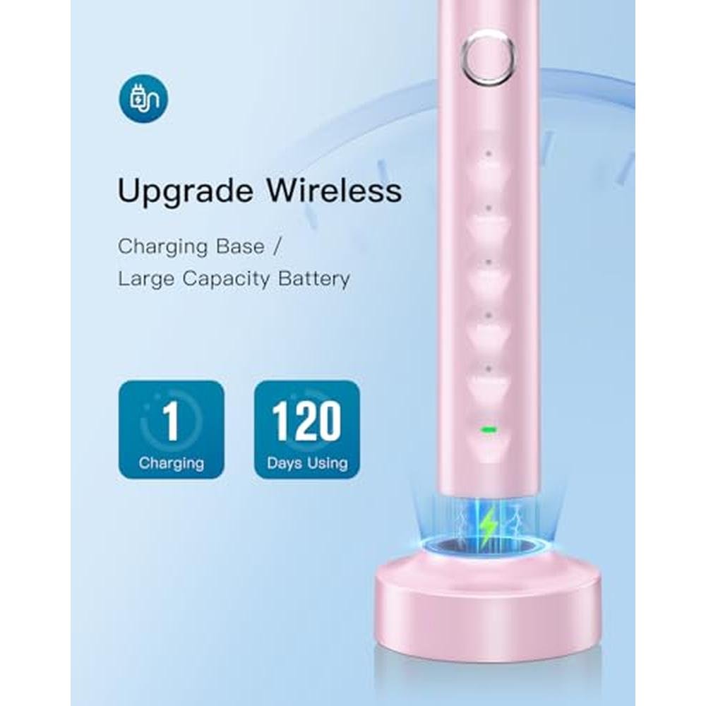 Rtauys Electric Toothbrush for Adults and Kids, Wireless Rechargeable Toothbrush One Charge for 120 Days, 5 Modes with Built-in Smart Timer 5 Brush Heads Pink