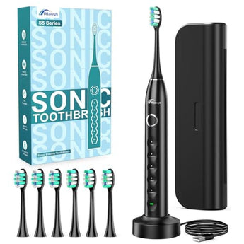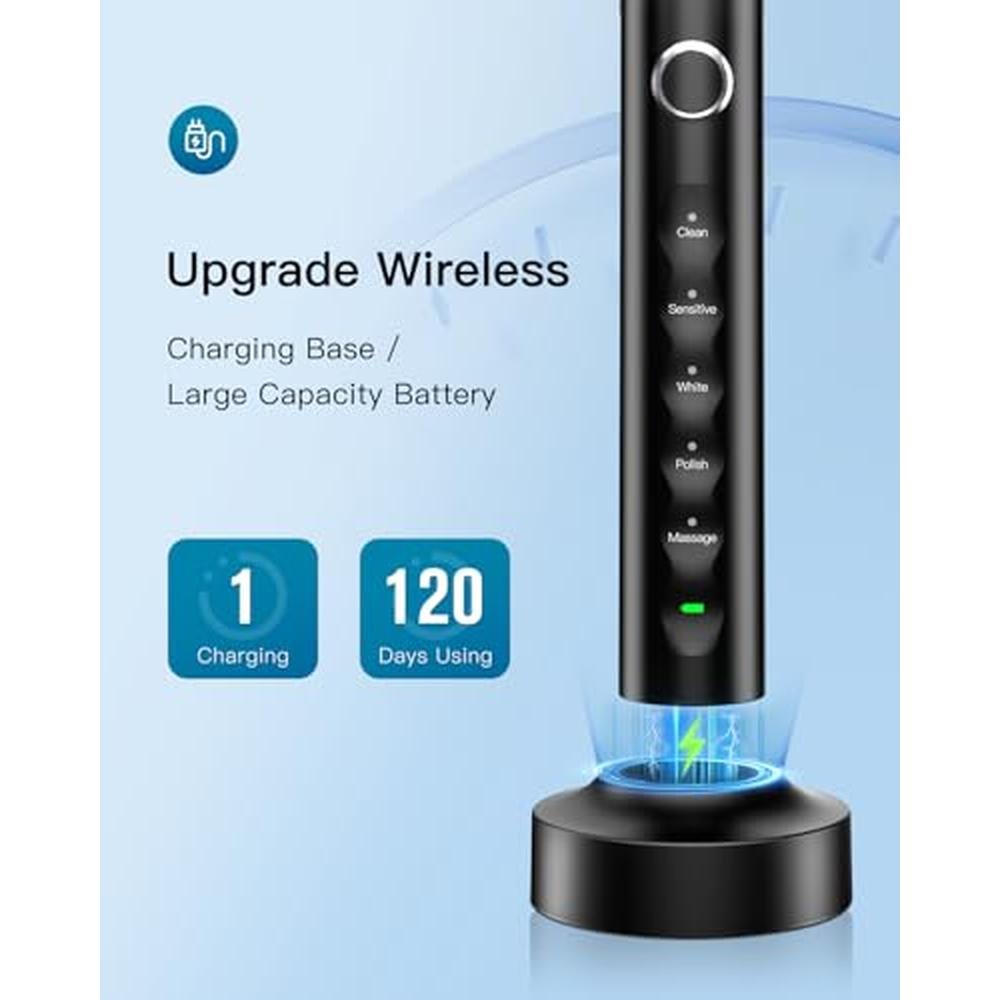 Rtauys Electric Toothbrush for Adults and Kids, Wireless Rechargeable Toothbrush One Charge for 120 Days, 5 Modes with Built-in Smart Timer 6 Brush Heads Black
