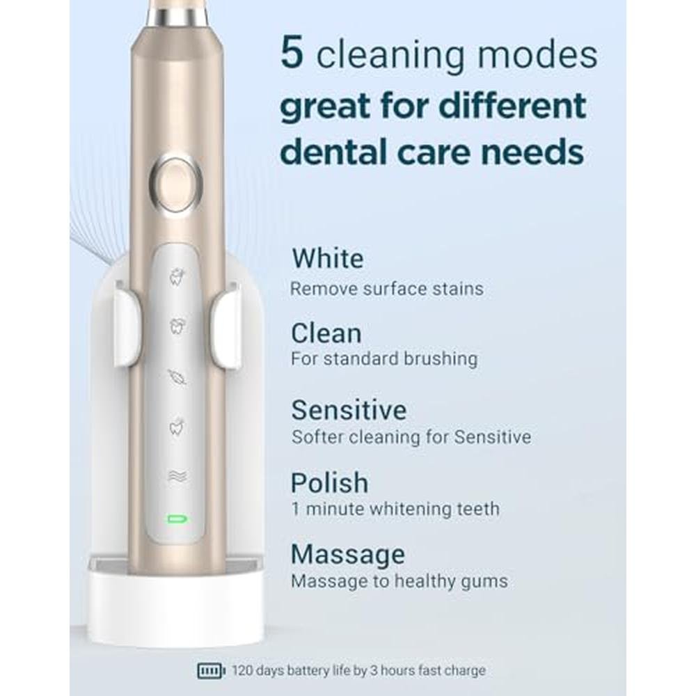 Rtauys M5 Sonic Electric Toothbrush for Adults - Rechargeable Electric Toothbrushes with 8 Brush Heads & Holder, Travel Case, Power Electric Toothbrush120 Days Battery Life - Champagne