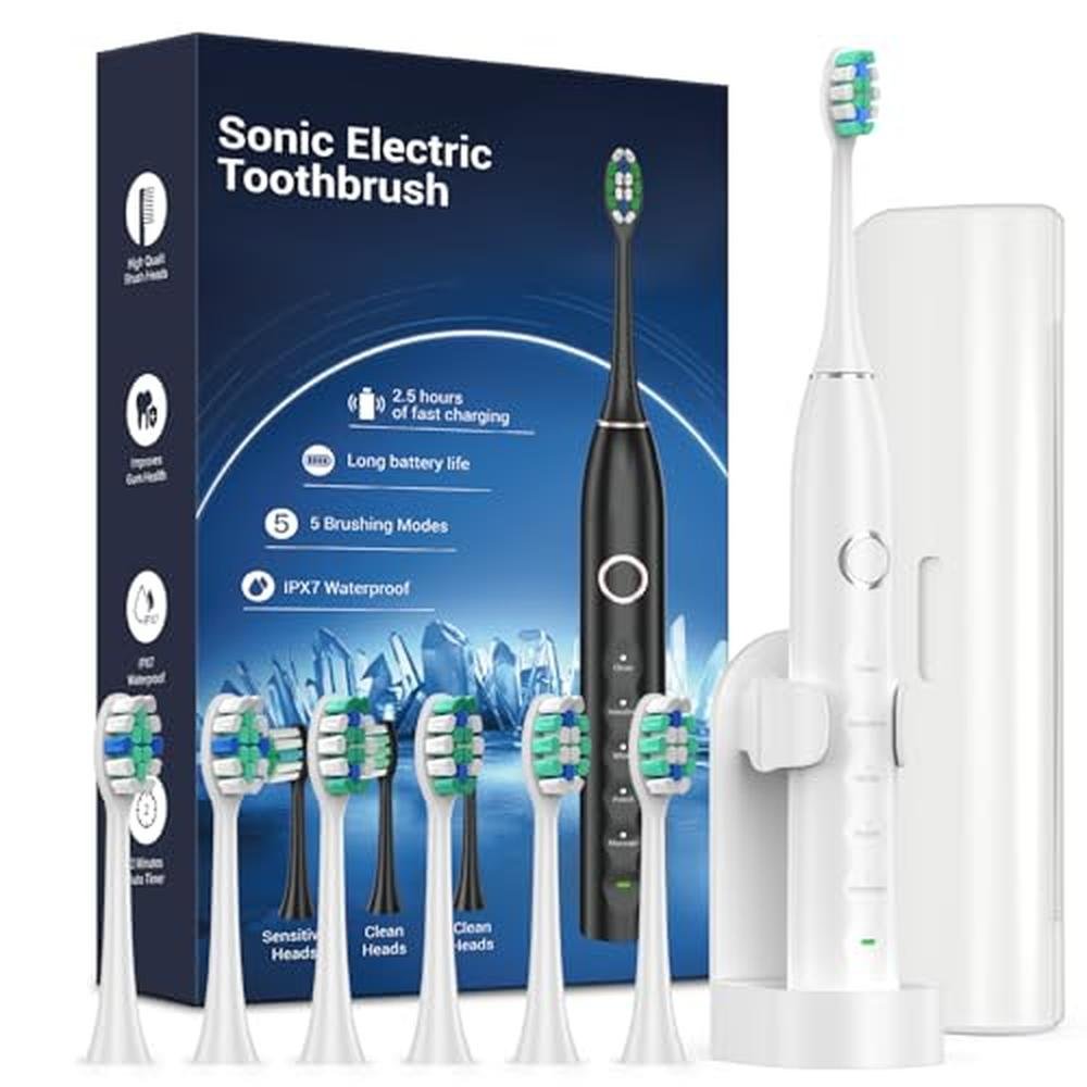 - 6 Replacement Brush Heads&Travel Case Included - It's recommended to replace toothbrush heads every 3 months, so 6 heads will last about 1.6 years. The electric toothbrush is designed to fit the shape of your teeth and clean gums and hard-to-reach areas thoroughly. It includes 2 sensitive brush heads and 6 cleaning brush heads for various gum types. The package also features a custom hard-shell travel case made of BPA-free plastic. With an extra-long battery life of up to 4 months on a full charge, its perfect for travel. Additionally, a toothbrush holder is included to keep your toothbrush clean and dry. This set makes an ideal gift for yourself, your family, or your friends.
