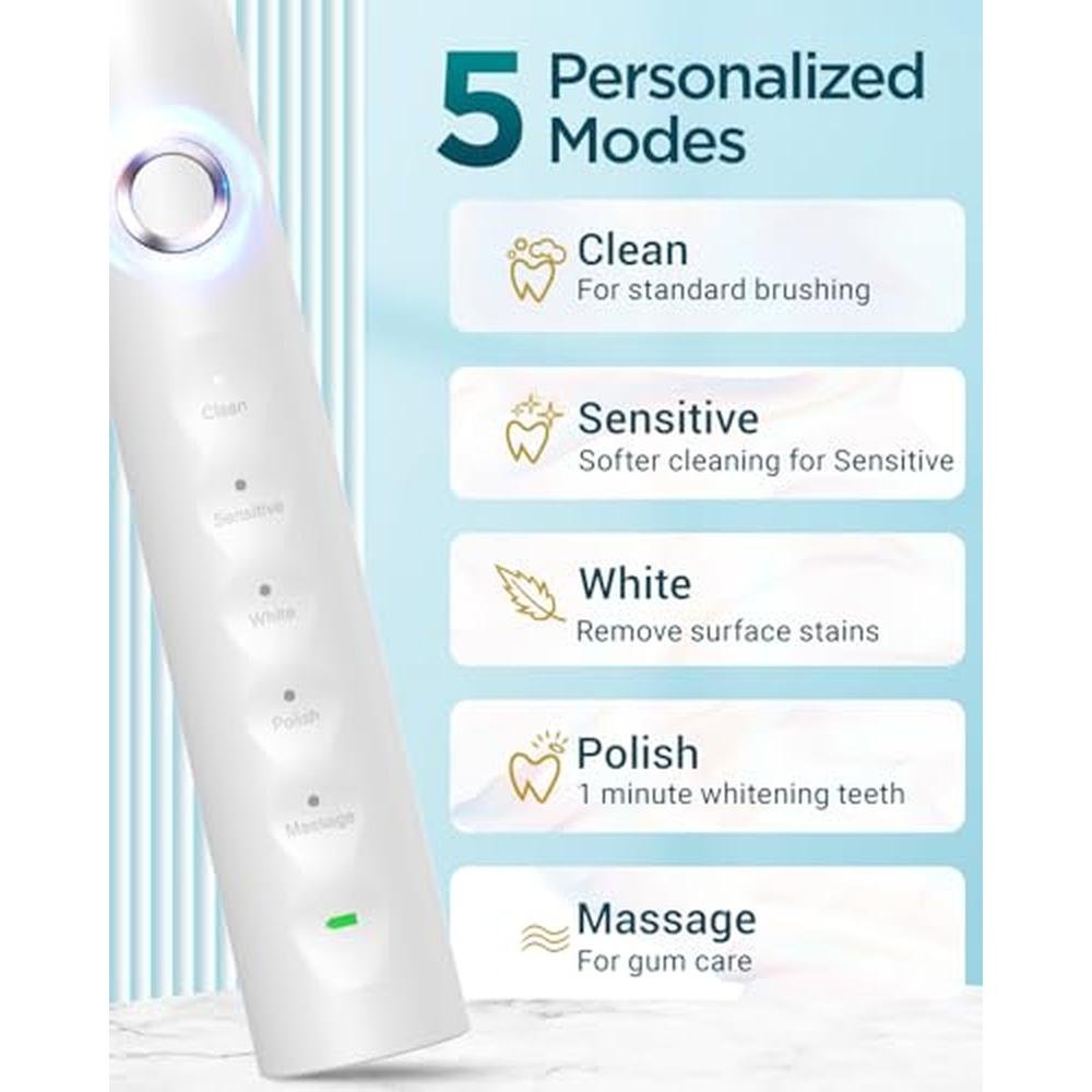 - 5 High-Performance Brushing Modes- Rtauys sonic electric toothbrush has 5 modes. Clean: For daily cleaning; Sensitive: Softer cleaning for sensitive; Whitening: Remove surface stains; Polishing: 1-minute whitening teeth; Massage: For gum care. These modes accommodate different teeth and gum conditions, ensuring comprehensive cleaning and care.