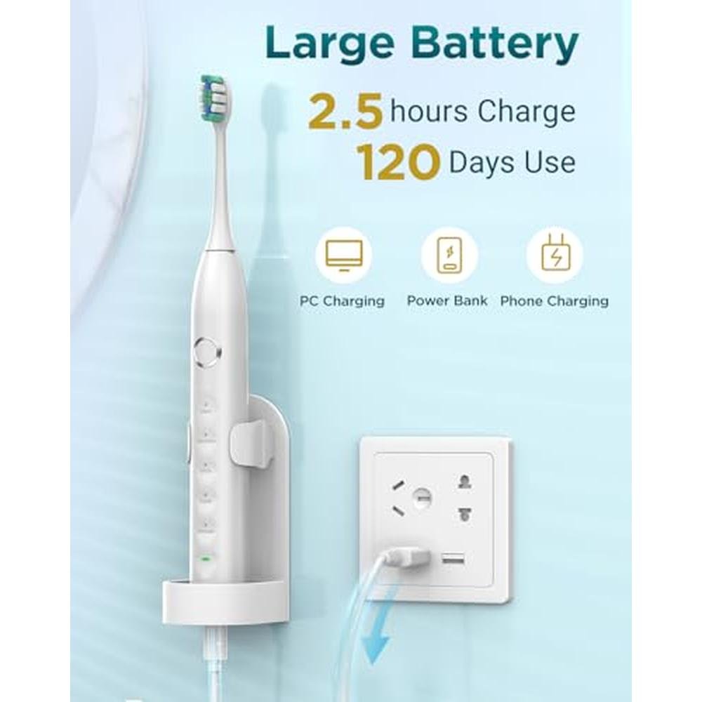- 120 Days Battery Life - The rechargeable electric toothbrush lasts up to 120 days on a single 2.5-hour charge. It features a low battery indicator that flashes red when the battery is low and offers ultra-fast USB-C charging. The included USB-C cable (adapter not included) eliminates the need for a bulky charging base, ensuring you never lose your charger. Plus, its compatible with any USB-C cable you have at home.