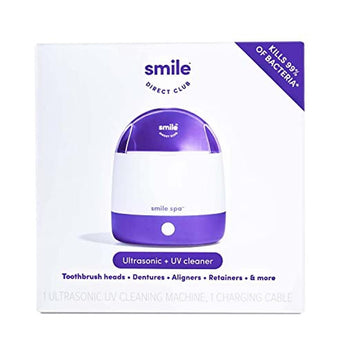 Direct club. Kills 99% of odor-causing bacteria (5 common odor-causing bacteria: S. aureus, P. aeruginosa, S. mutans, P. Iosheii, F. nucleatum, after the 10-minute cleaning cycle). Toothbrush heads. Dentures, aligners, retainers, & more. 1 ultrasonic UV cleaning machine, 1 charging cable. Just add water. If it goes in your mouth, smile spa safely cleans it: toothbrush heads, dentures, aligners, retainers, mouthguard, nightguards, TMJ appliances, water flosser tips, and more. Exclusive combination of ultraviolet light and ultrasonic waves. Cleans toothbrush heads - a smile spa exclusive. Set it and forget it - cleans in just 10 minutes. Cleans with water alone, or add a cleaning tablet. Keep it clean. Made in China. Designed and engineered by SmileDirectClub in Nashville, TN, USA.