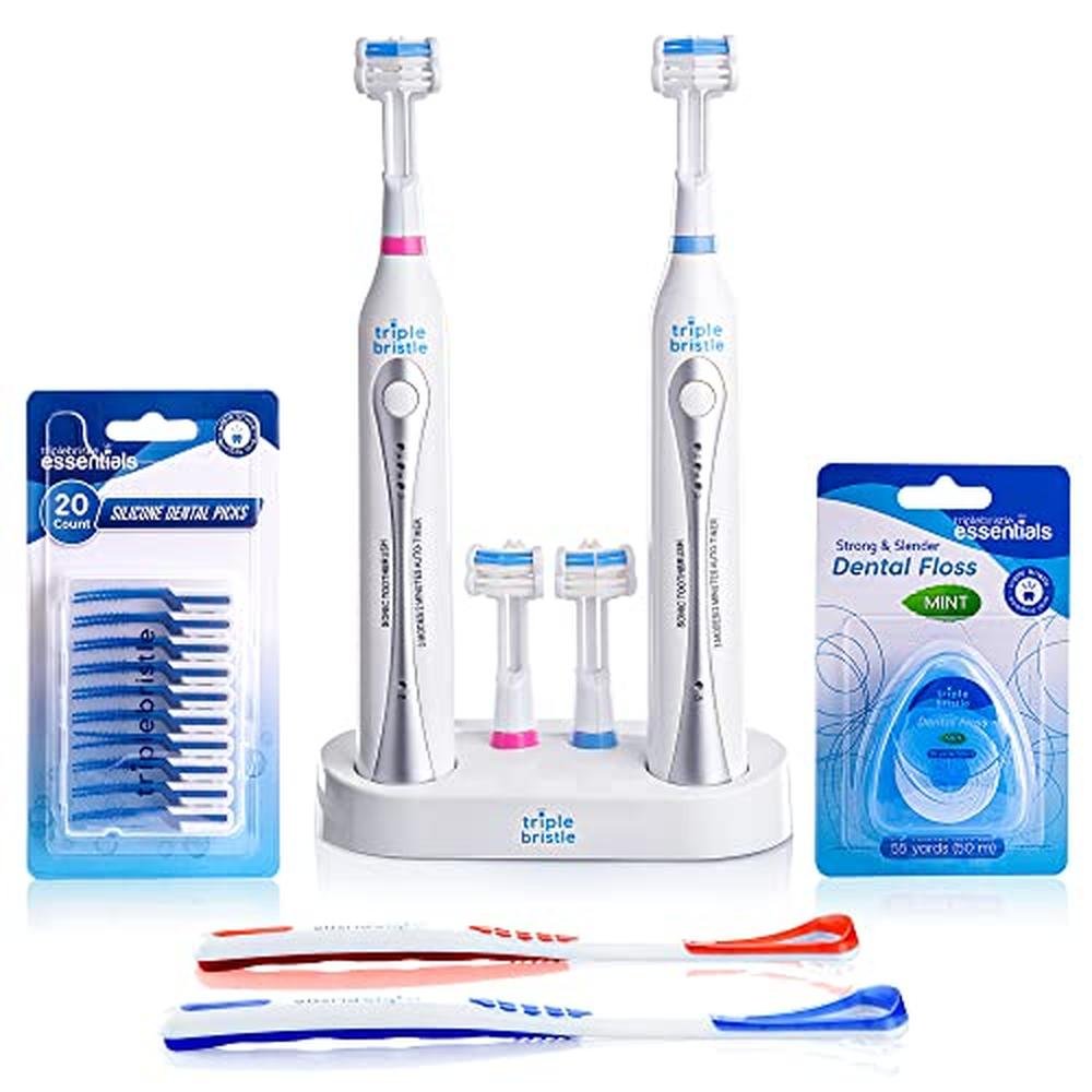 Triple Bristle Duo | 2 Sonic Toothbrushes with Dual Charging Station | Patented 3 Head Design | 31,000 VPM Electric Toothbrush Set | for Adults, Families & Couples | Triple Bristle Duo + Oral Kit