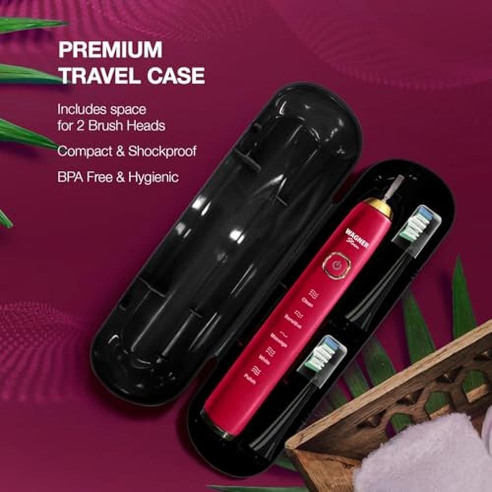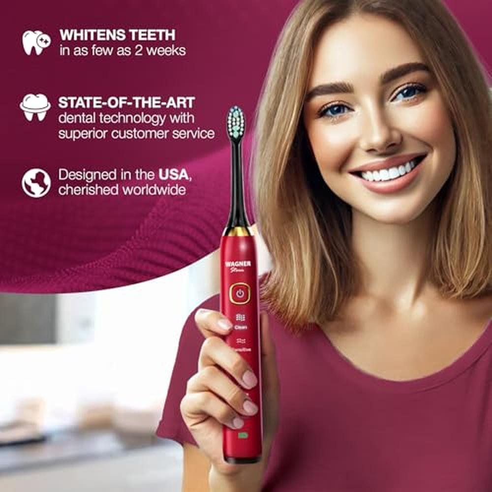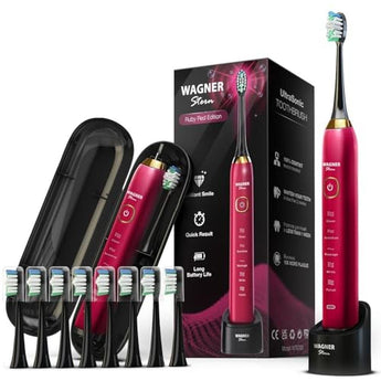 Elevate your oral care routine with the Wagner Stern The Ruby Red Edition ultrasonic whitening electric toothbrush, featuring five customizable brushing modes, eight soft brush heads, and a premium travel case for a superior electric toothbrush experience. This advanced toothbrush ensures a healthier and cleaner smile, making it an ideal gift for family, relatives, or friends.