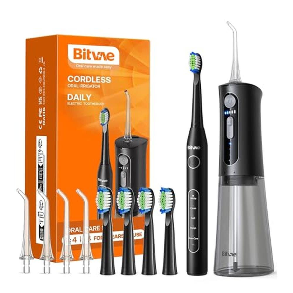 Bitvae 300ML Water dental flosser And Electric Toothbrush Combo Electric Teethbrush Specifications: Power: 5W Charging Time: Approx. 4 hours Battery Life: 1 Charge = 30 days of use Electric Teethbrush Main Feature: 1,Deeply Clean Teeth and Removes up to 7X More Stains . 2, Powerful & rechargeable lithium battery. 3, Portable design, ideal for travel. 4, 5 High-performance brushing modes. 5, Built-in timer pulses every 30 seconds Water dental flosserMain Feature: 1, Deep cleansing for your teeth and gum lines. 2, Powerful & rechargeable lithium battery. 3, Portable design, ideal for travel. 4, 300ml larger water tank, easy to clean and removable. Specifications: Power: 5W Charging Time: Approx. 4 hours Battery Life: 1 Charge = 30 days of use Reservoir Capacity: 300 ml / 10.0 floz Pressure Range: 30-100psi Whats in the Box: 1 x Teeth flosser 1 x Electric Teethbrush 4 x Water Nozzles 4 x Repalcement Brushhead 2 x Charging Cable 2 x User Guide