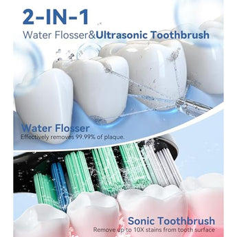 - Dual High-Efficiency Oral Care SystemIncludes a household oral irrigator and an ultrasonic electric toothbrush. The water dental flosser operates at 30~125 psi, effectively eliminating food residues and dental plaque from between teeth. The 4000 VPM electric toothbrush efficiently cleans the tooth surfaces, removing stubborn stains 10x more effectively, helping you effortlessly achieve a healthy and clean smile.