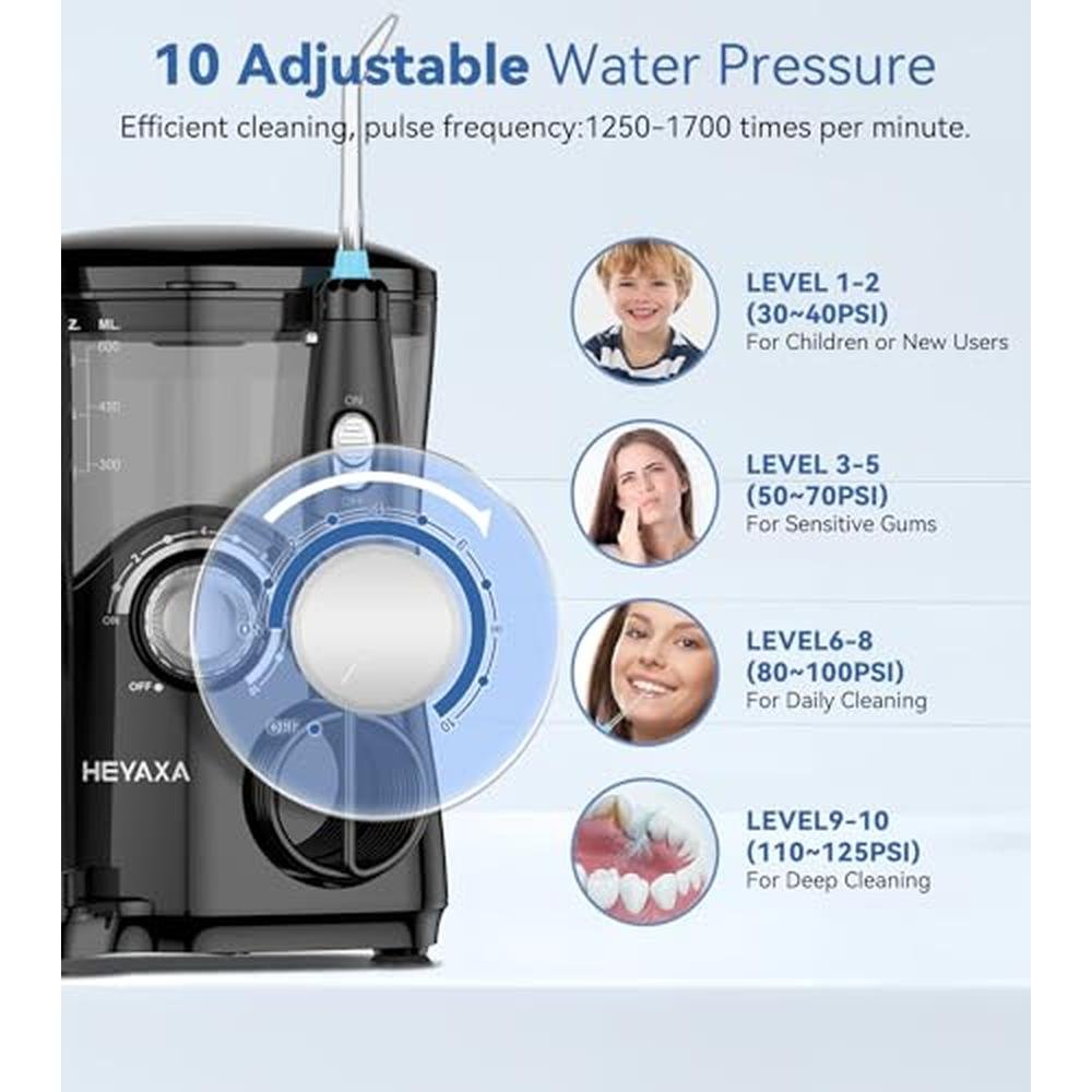 - 600ml Large Capacity WaterThe 600ml large tank oral irrigator provides up to 90 seconds of continuous use, thoroughly cleaning the oral cavity. It offers 10 psi modes suitable for both children and adults, catering to diverse oral hygiene needs and ensuring optimal oral care for the whole family.
