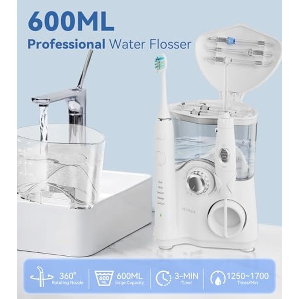 Experience unparalleled oral care with our Water Flosser & Ultrasonic Electric Toothbrush Combo. This premium dental care system features a 600ML water dental flosser with 7 jet tips, 10 adjustable water pressure, and 5 toothbrush heads. Perfect for removing tonsil stones and maintaining healthy gums and teeth.