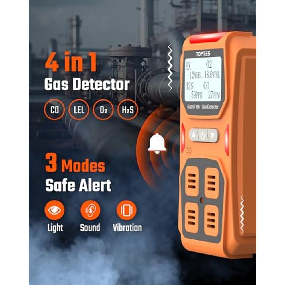 TopTes Guard-156 4 Gas Monitor Multi Gas Detector for H2S, CO, LEL, and O2, Triple Alarm Modes (Visual, Vibration, Sound), 0.5s Fast Response, Dust and Explosion Proof Design for Work and Home Safety