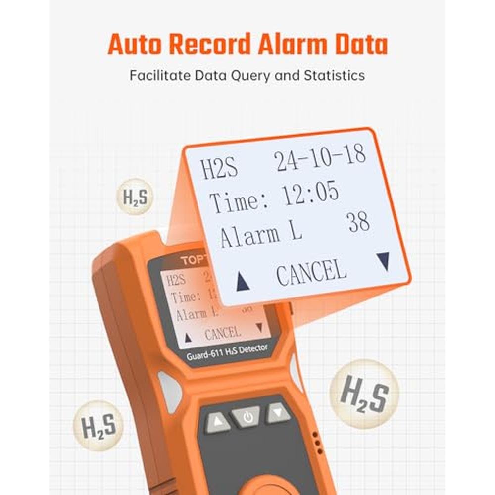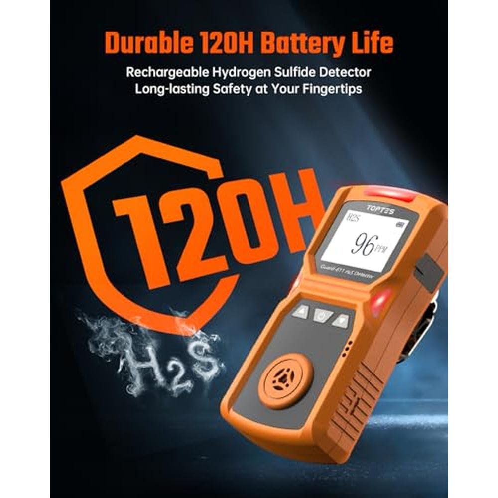 - Rechargeable Battery, Long-lasting Power: TOPTES Guard-611 H2S monitor has a rechargeable battery with up to 5-day operation, real-time battery indicators, and low-battery alerts, ensuring continuous monitoring for H2S gas