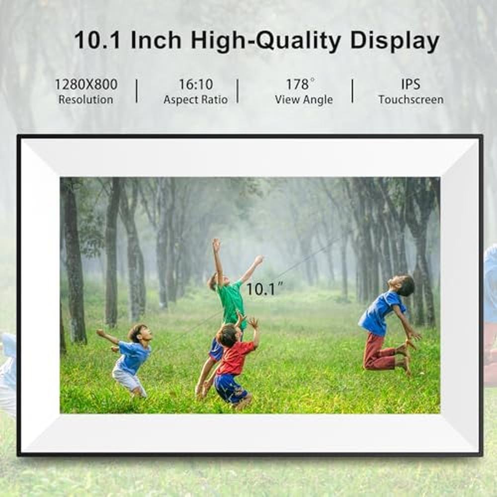 • & :With 10.1 inch 1280*800 IPS HD touchscreen, digital frame brings out photo details from every angle, offering an incredible visual treat. Using the electronic photo frame's touchscreen, you can easily tweak settings like slideshow order, interval timing, image hiding, caption display, and sleep mode to match your photo viewing style