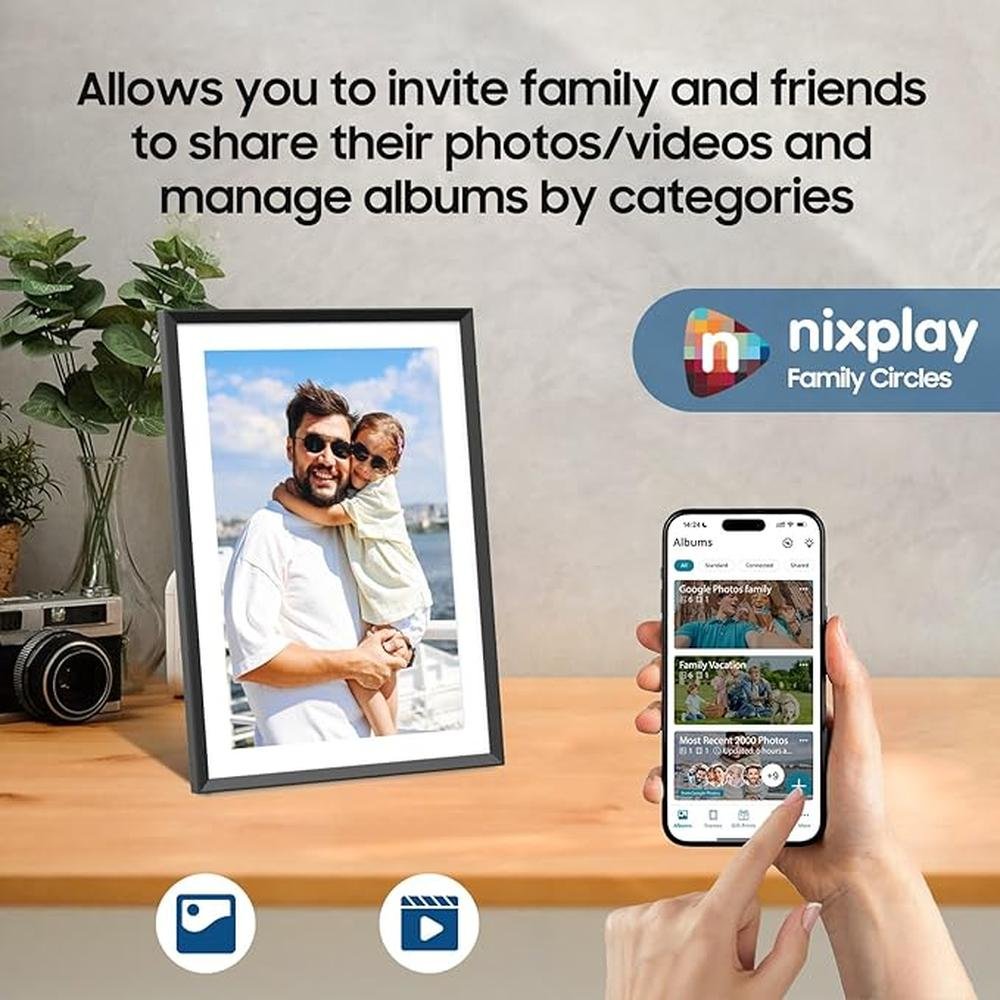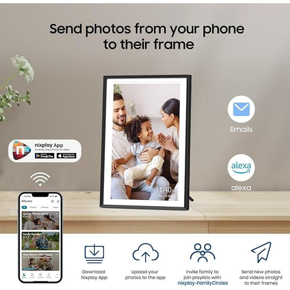 • Setup is As Easy As 1-2-3 - With the Nixplay app (available for Android and iOS), you can invite multiple users to upload photos to the frame. You can even connect multiple digital picture frames to the app to share precious moments across devices. Nixplay also supports logging in via the desktop web app or emailing photos directly to the frame. With this digital picture frame, you can keep a rotating collection of photos and videos going all day long