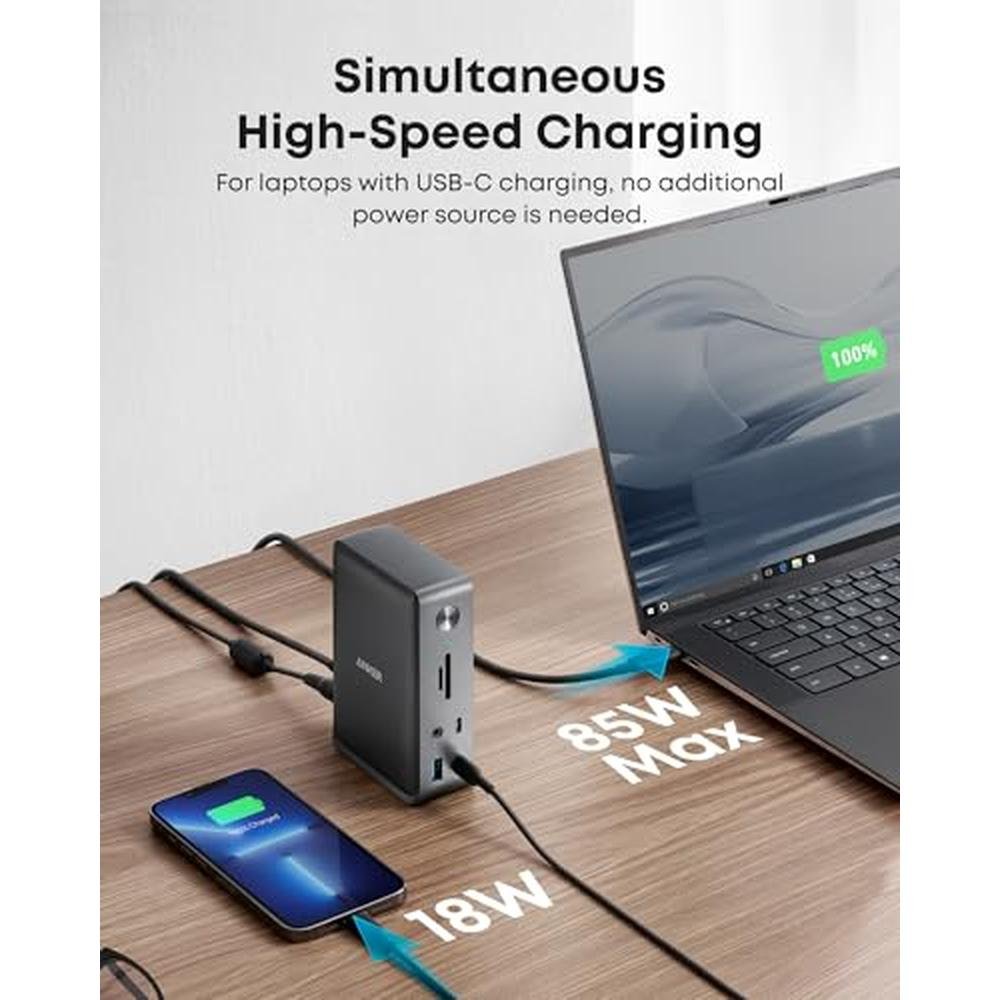 - The Anker docking station features a stunning triple display capability, with 2xHDMI and 1xDp, offering breathtaking visuals and an immersive experience, perfect for Indian buyers who value high-quality visuals and immersive entertainment.